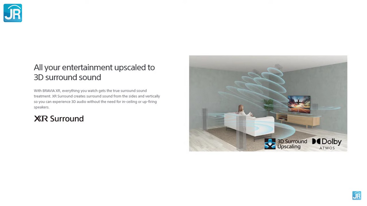 - XR Surround; Mengusung 3D Surround Upscaling. Fitur ini membuat suara dari video apapun yang ditonton diproses menjadi “3D Audio”. XR Surround, didukung dengan 2x Full Range Speaker dengan Bass Reflex + 2x Tweeter. Ini membuat TV ini jadi bisa menghasilkan surround sound secara vertikal maupun horizontal.