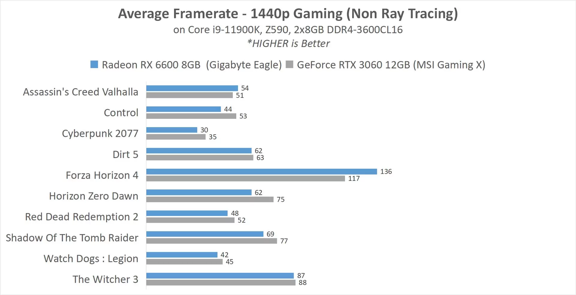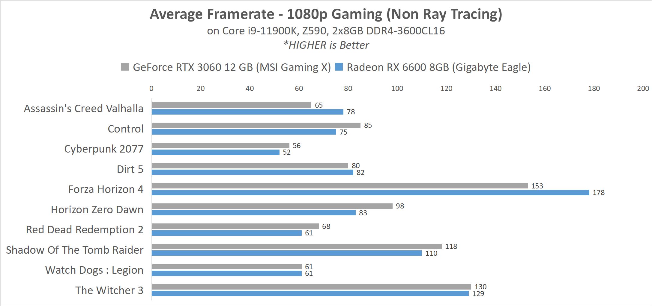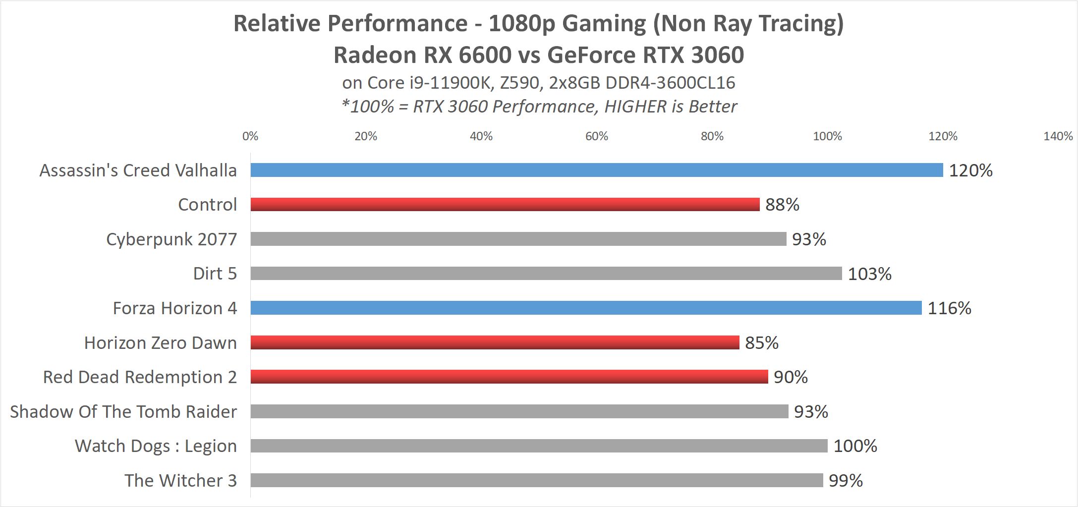RX 6600 kelihatan unggul di beberapa titel spesifik seperti AC Valhalla, dan Forza Horizon 4, dan RTX 3060 unggul di Control, Horizon Zero Dawn, dan Red Dead Redemption 2. Game lain seperti Dirt 5, SOTTR, Watch Dogs Legion dan The Witcher 3 menunjukkan perbedaan di bawah 10% yang tidak kami anggap membawa perbedaan signifikan pada gaming experience.