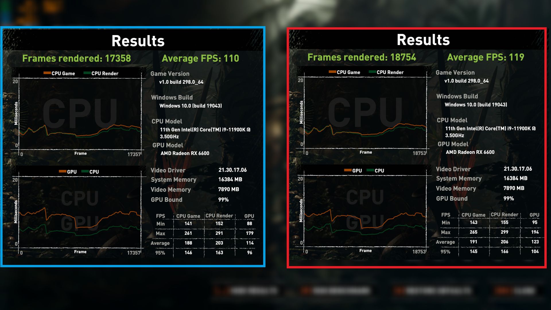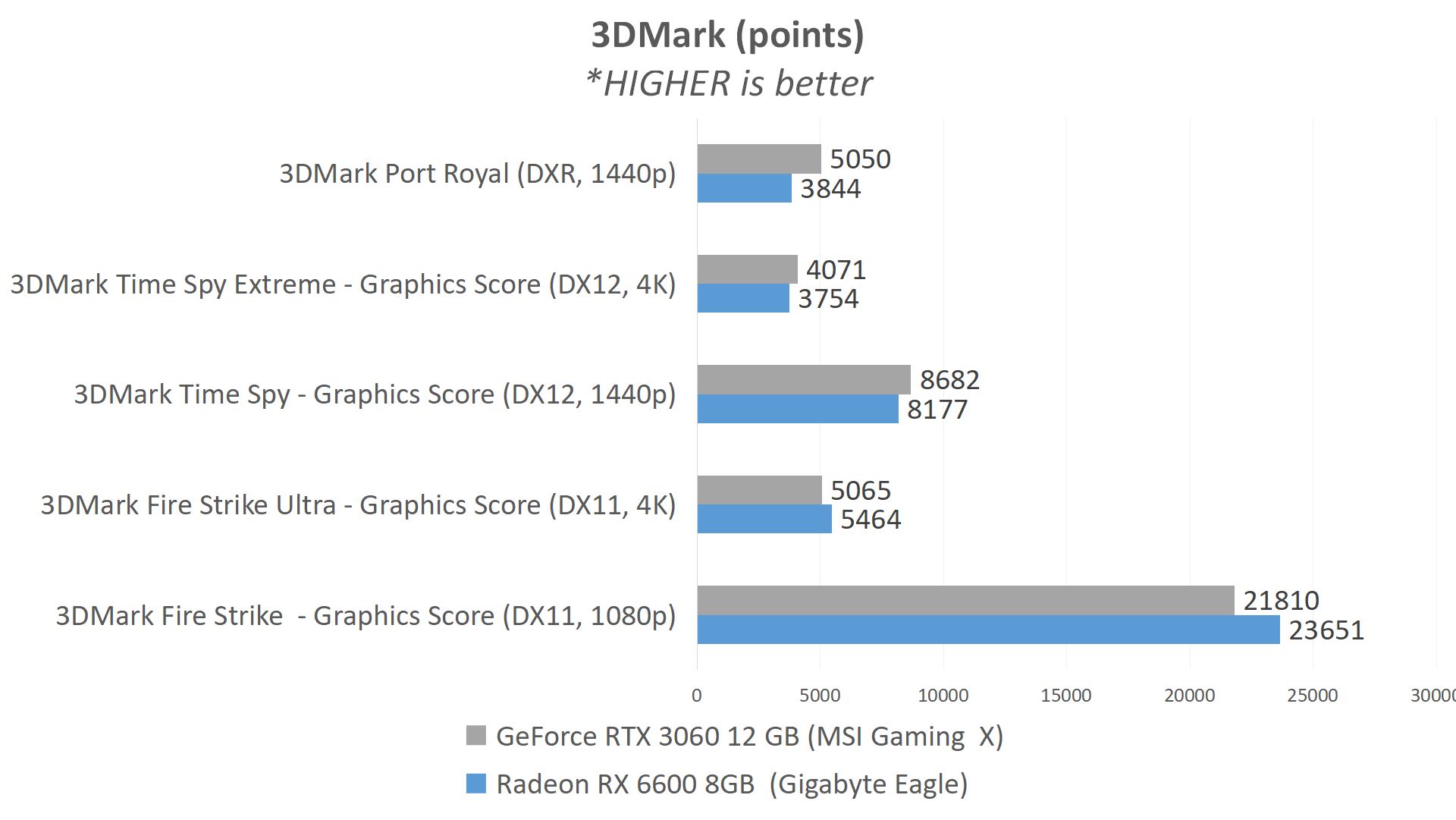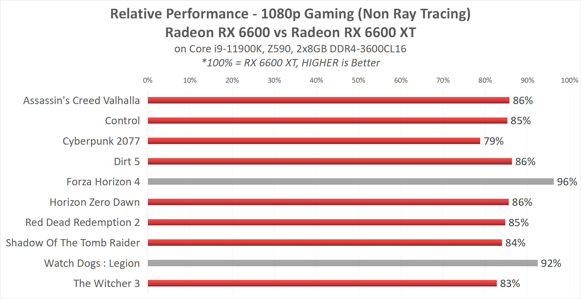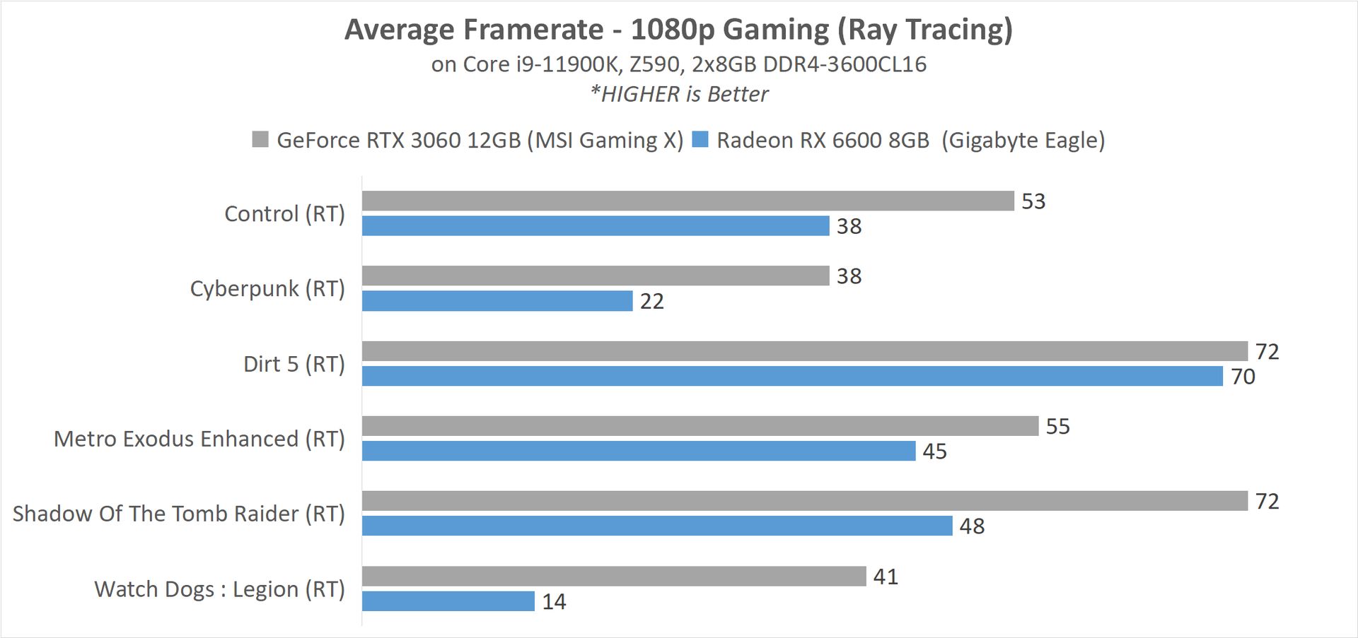 RX 6600 kelihatan unggul di beberapa titel spesifik seperti AC Valhalla, dan Forza Horizon 4, dan RTX 3060 unggul di Control, Horizon Zero Dawn, dan Red Dead Redemption 2. Game lain seperti Dirt 5, SOTTR, Watch Dogs Legion dan The Witcher 3 menunjukkan perbedaan di bawah 10% yang tidak kami anggap membawa perbedaan signifikan pada gaming experience.