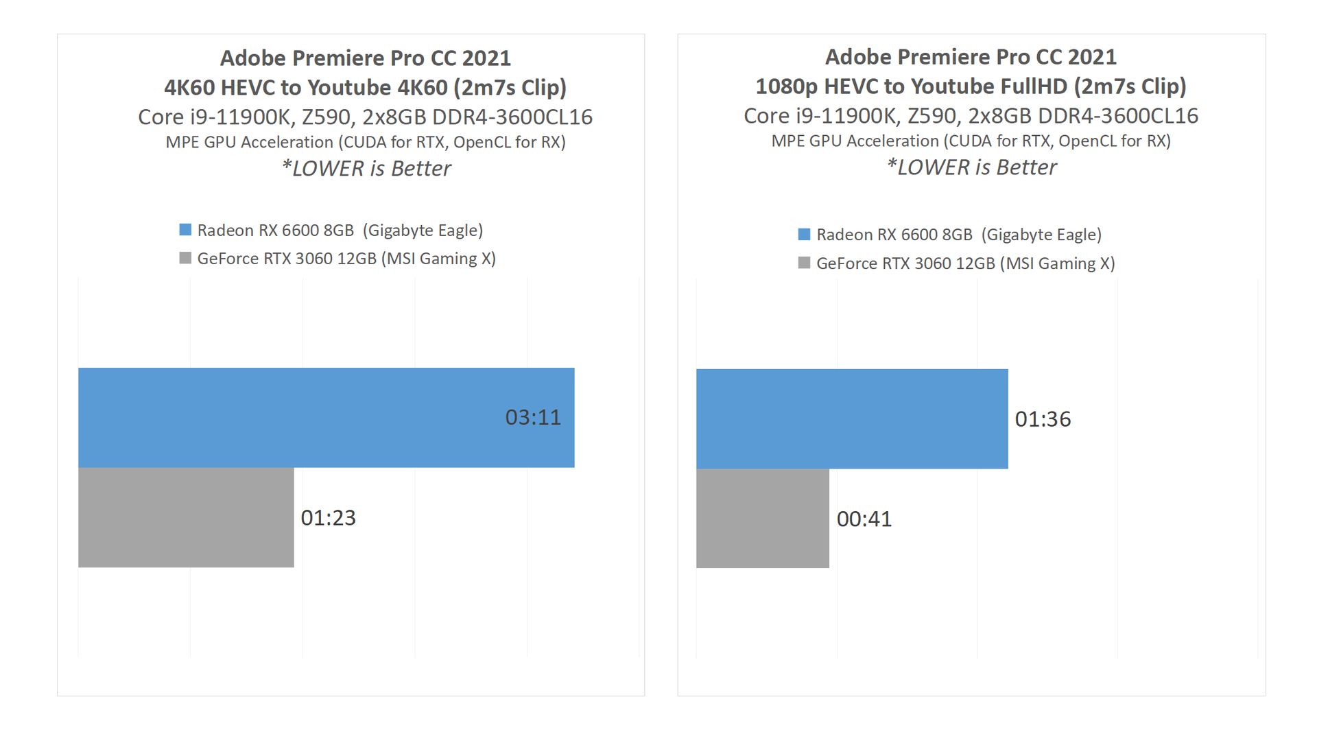 Pada pengujian di aplikasi yang cukup optimal pada CUDA API seperti skenario Adobe Premiere Pro CC Video Export kami, RTX 3060 meninggalkan RX 6600 dengan cukup jauh. Namun demikian, RX 6600 sendiri nampak masih memiliki performa video Export yang relatif cukup pada 1080p.