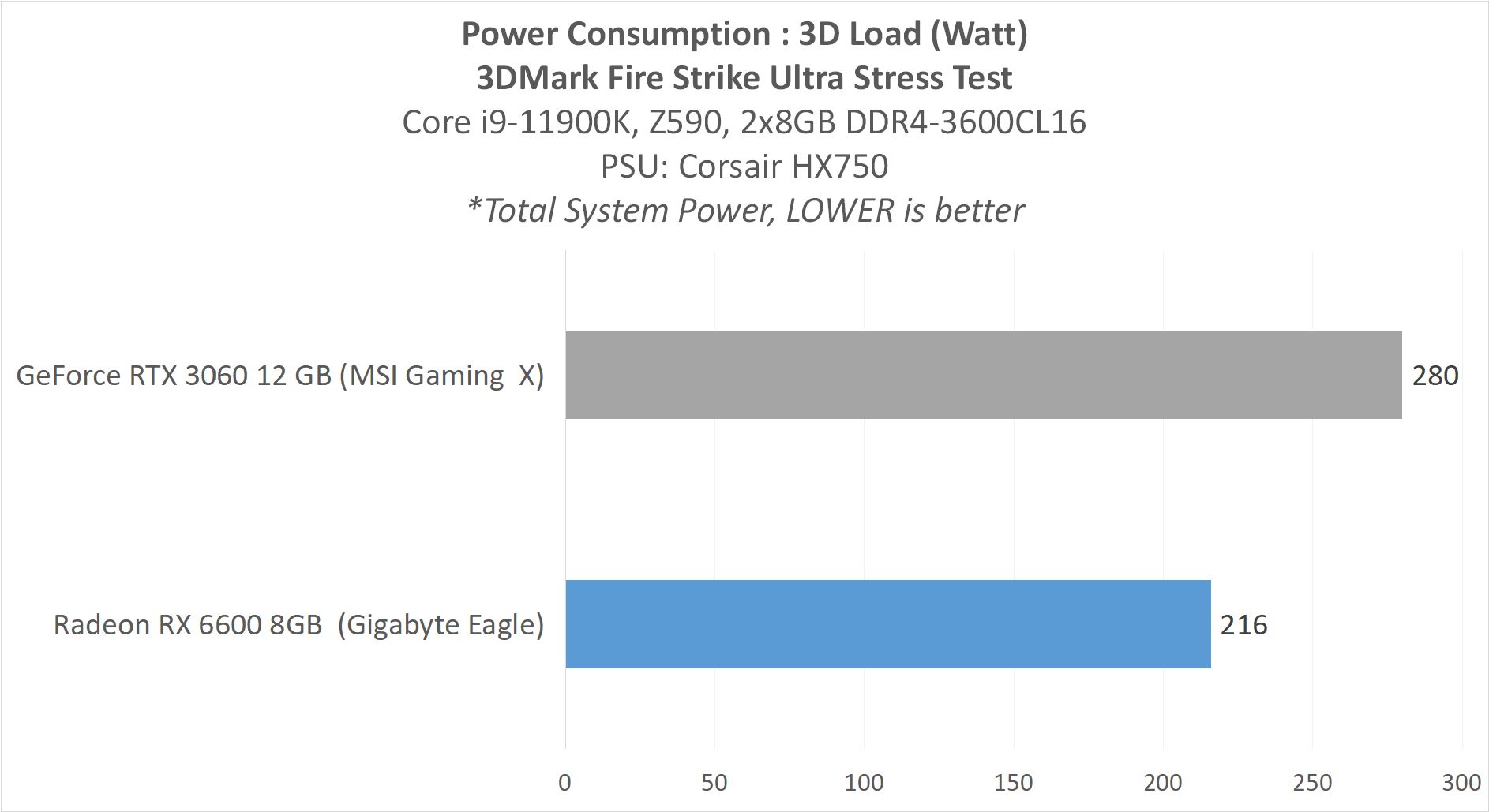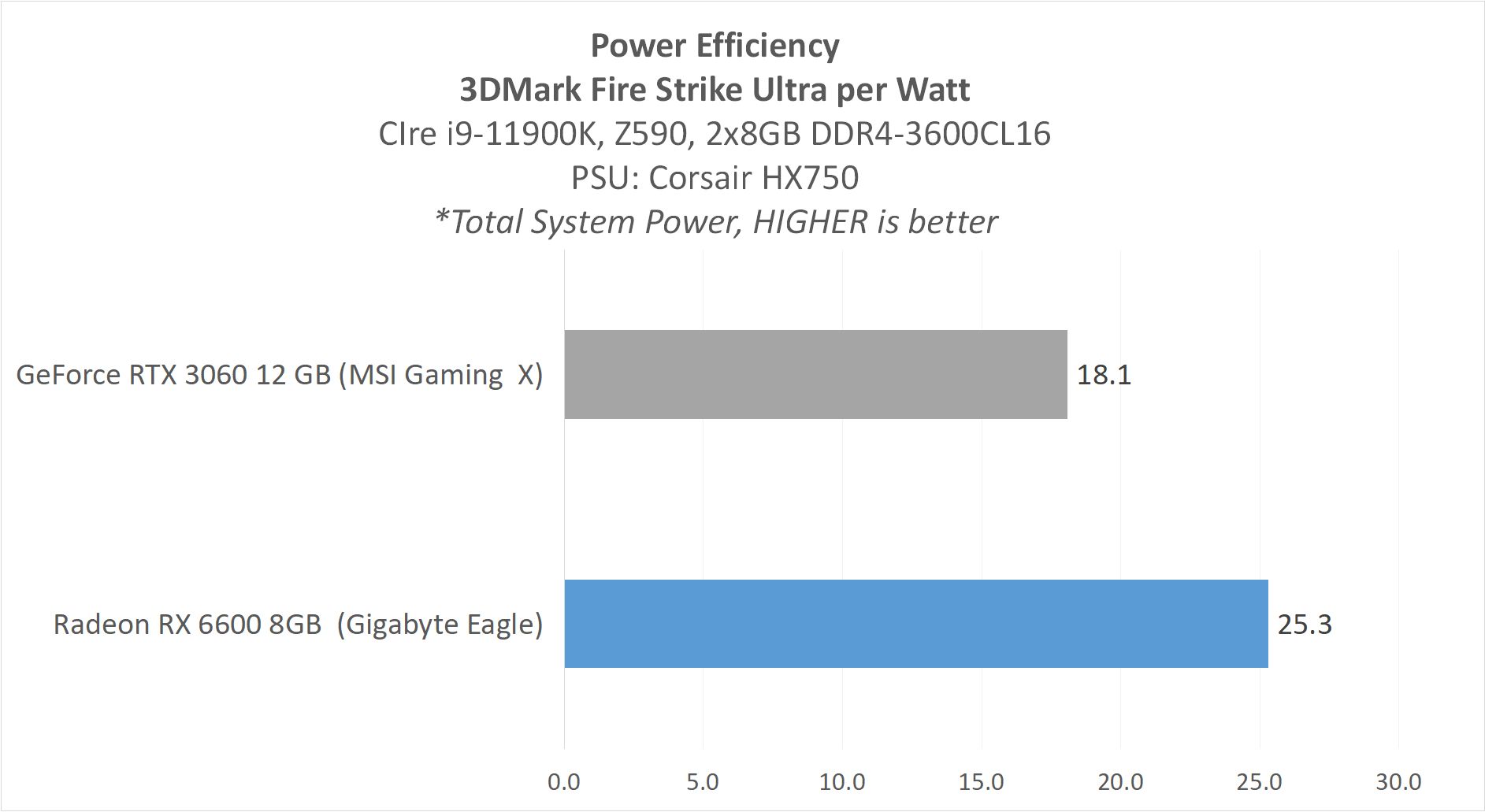 Efisiensi daya nampaknya menjadi area dimana RX 6600 memiliki keunggulan menonjol, GPU RX 6600 menunjukkan konsumsi daya yang relatif rendah walaupun clockspeednya sudah relatif tinggi, dan nampaknya aspek ini yang membuat AMD berani memberikan rekomendasi PSU 450W pada GPU tersebut.