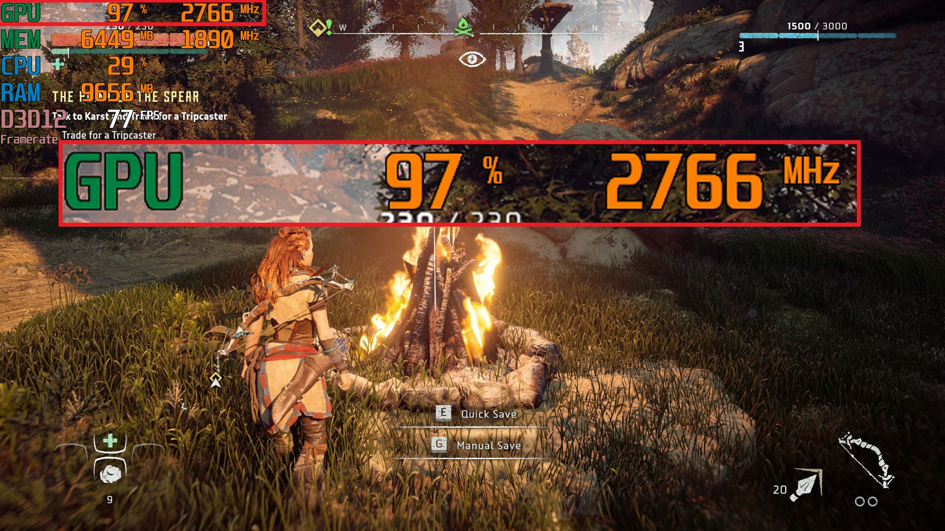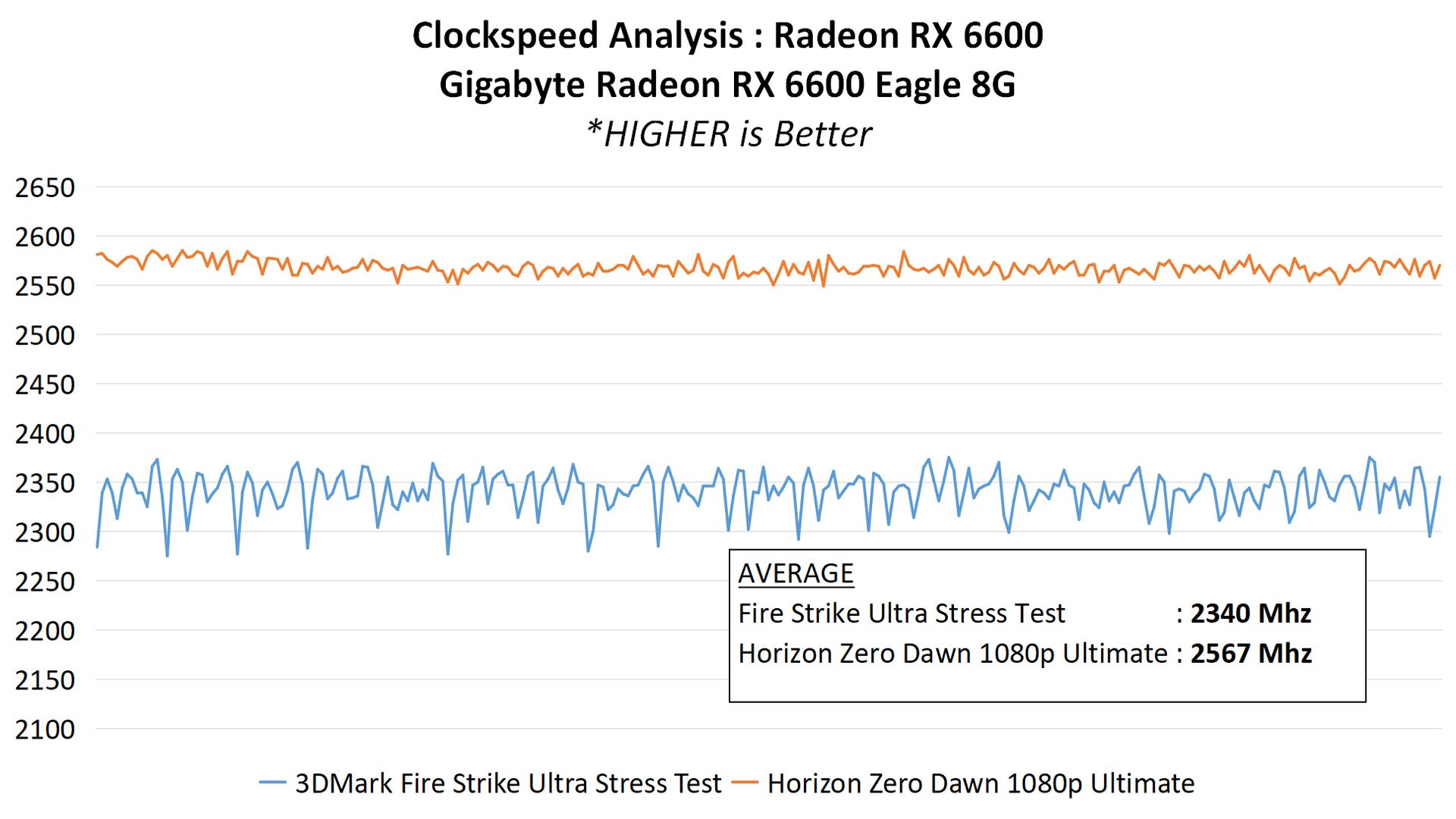 Clockspeed dari Gigabyte RX 6600 ini relatif tinggi. Meskipun hanya diberi rating 2Ghz-an Game clock, namun kami secara konstan menemui kecepatan GPU ini ada di range 2.3 Ghz pada 3DMark Stress Test yang berat, dan bahkan melebihi 2.5 Ghz pada game 1080p seperti Horizon Zero Dawn.