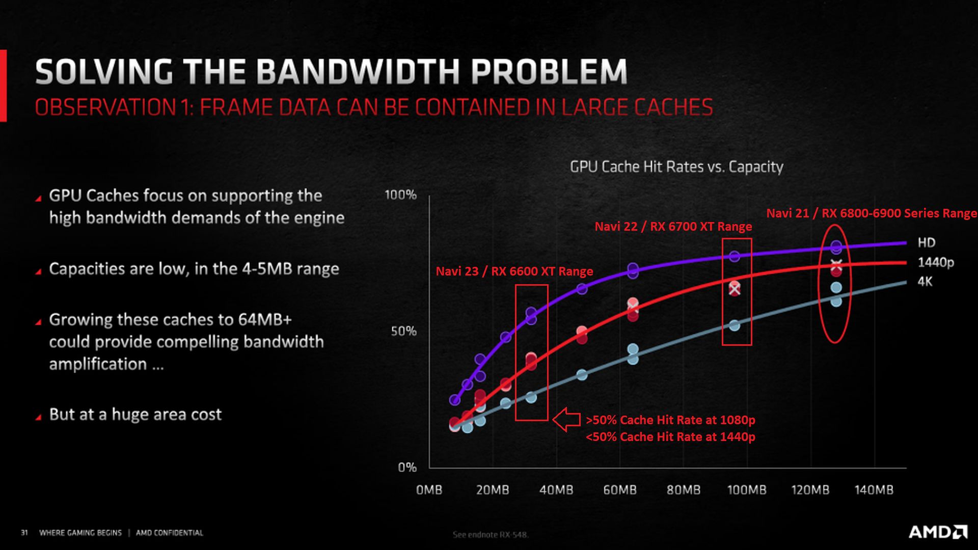 Infinity cache besar seperti 96MB pada 6700XT dan 128MB pada 6800XT bisa efektif pada resolusi tinggi seperti 1440p atau bahkan 4K. Namun ukuran 32MB pada RX 6600 dan RX 6600 XT membuat cache ini efektif di resolusi 1080p, dan limitasi memory bus width-nya akan terlihat begitu resolusi lebih tinggi digunakan.