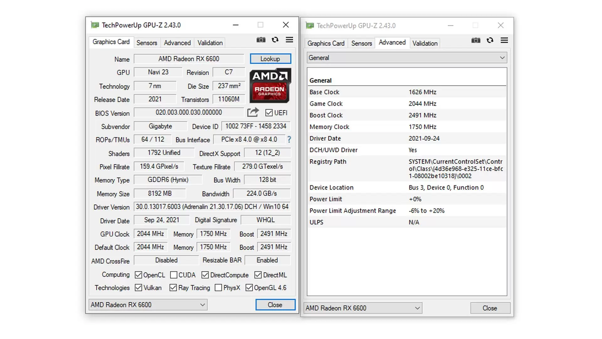 Gigabyte RX 6600 Eagle ini memiliki desain yang nampak serupa dengan Gigabyte RX 6600 XT Eagle, dan hanya berbeda chip GPU-nya saja. Melihat spesifikasi yang dibaca GPU-Z, nampak juga kalau GPU ini masih menggunakan clockspeed sesuai reference dari AMD (2.04 Ghz Game clock, Max 2.49 Ghz Boost Rating). Terbaca juga ada headroom tuning power limit 20% lebih tinggi dari default.