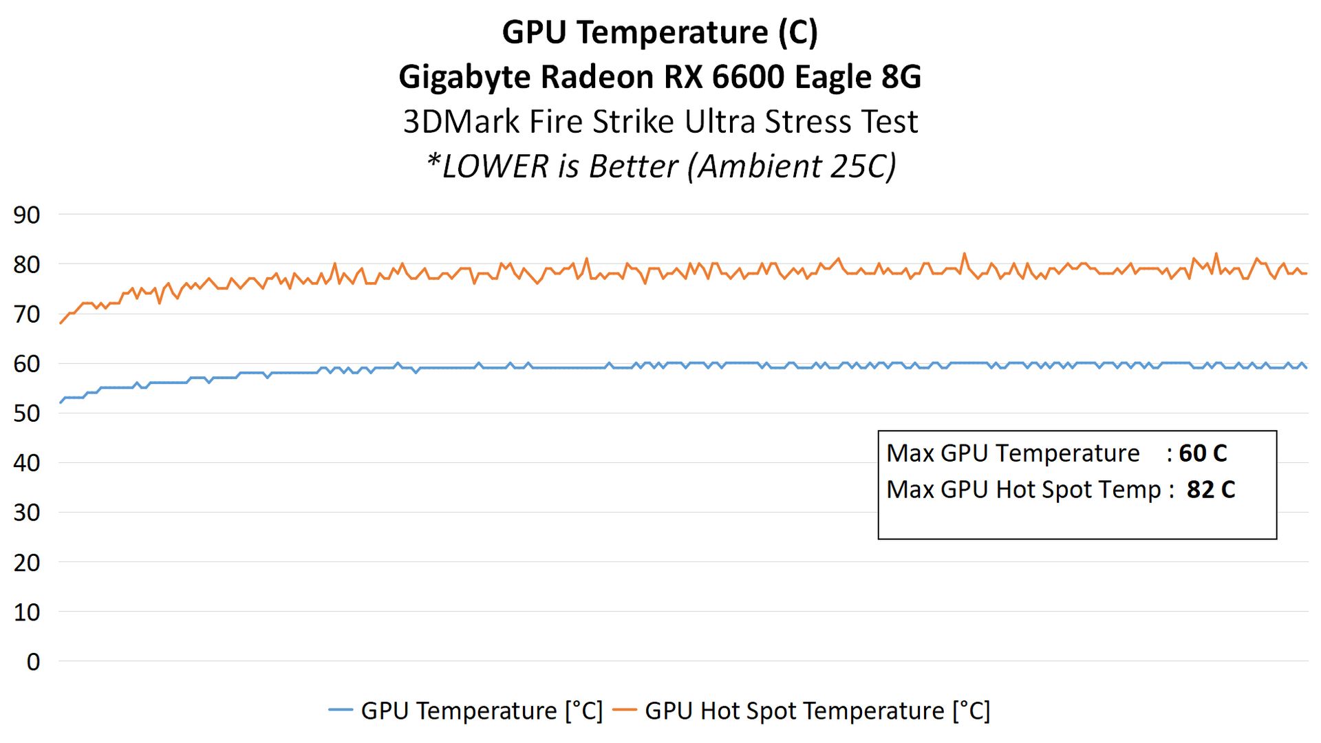 Temperatur GPU Gigabyte RX 6600 saat 3DMark Stress Test termasuk wajar. Suhu ini dicapai dengan kecepatan kipas pada sekitar 61% (1900 RPM-an), dan kipas masih termasuk sunyi pada kecepatan ini.