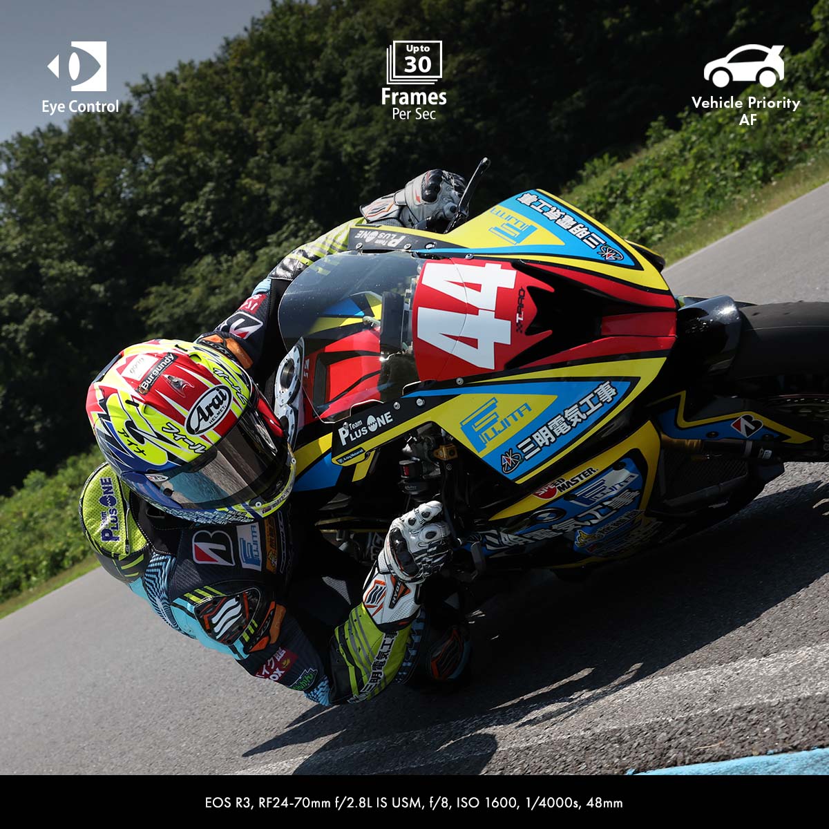 Selain fitur Eye Detection AF dan Animal Detection AF, EOS R3 memiliki fitur baru yang sangat didambakan para penggemar fotografi aksi cepat otomotif yaitu Vehicle Priority AF. Fokus otomatis pada EOS R3 dapat mendeteksi mobil dan sepeda motor yang bergerak cepat, bahkan untuk fokus yang lebih spesifik pada helm si pengemudi. Kamera ini juga memiliki deteksi AF hingga EV -7.5 yang sangat membantu pengguna mendapatkan fokus saat membidik di kondisi minim cahaya.