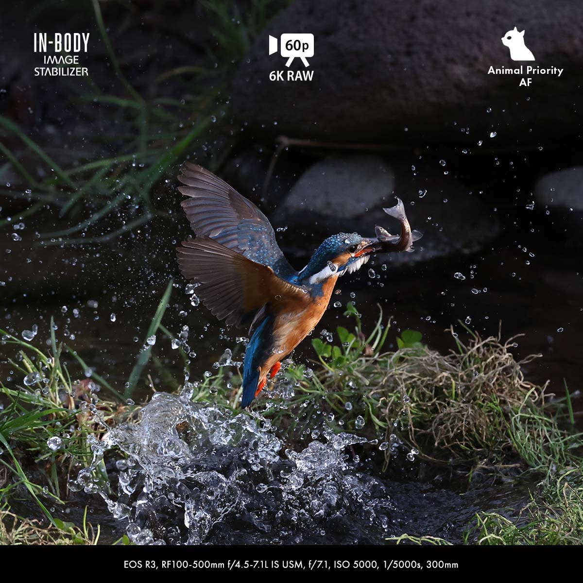 Seperti EOS R5 dan R6, EOS R3 juga dilengkapi dengan 5 AXIS In-Body Image Stabilization hingga 5,5 stop dan saat dipasangkan dengan lensa RF yang kompatibel, efektivitasnya bisa mencapai 8 stop, membuat pengambilan video sambil berjalan lebih halus, dan juga pada saat pemotretan long exposure tanpa tripod pun menjadi lebih stabil.