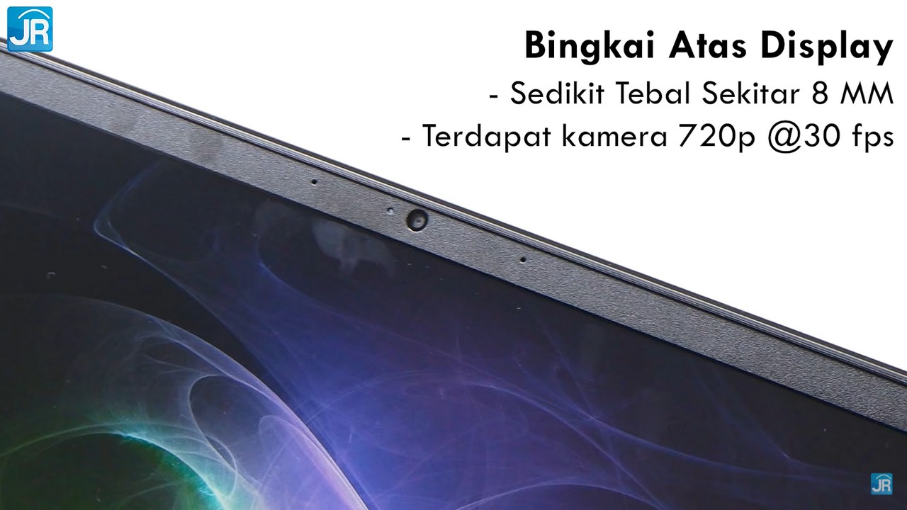 Bingkai kanan-kiri tergolong tipis yaitu dengan ukuran 4mm. Sementara untuk bingkai atas sedikit tebal (8 mm) karena ada kamera 720p 30fps.
