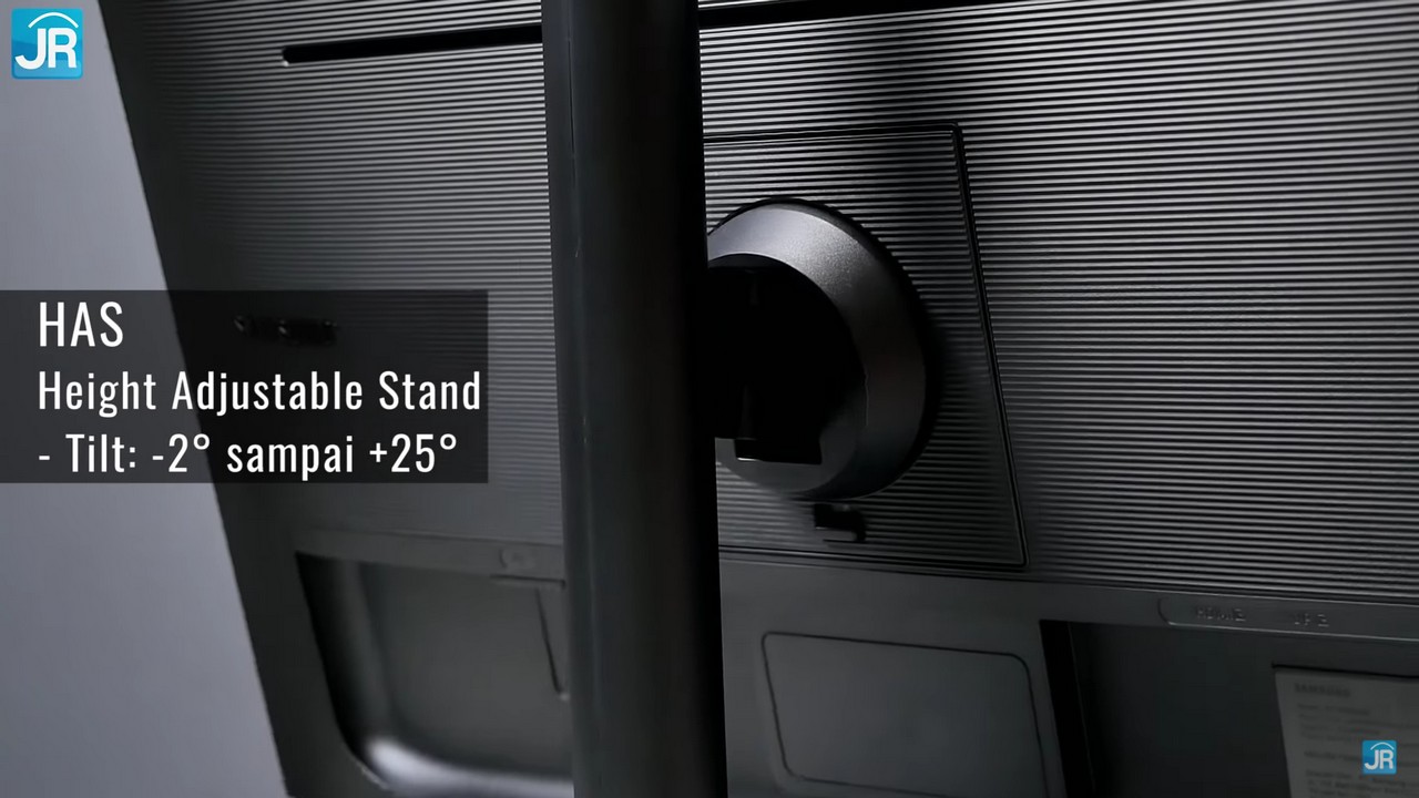 Stand monitor ini disebut sebagai HAS (Height Adjustable Stand), jadi bagian leher stand ini punya mekanisme untuk mengatur ketinggian layar, hingga +/- 5 cm dari titik tengah. Menariknya, bukan cuma menawarkan pengaturan ketinggian, stand ini juga menawarkan: