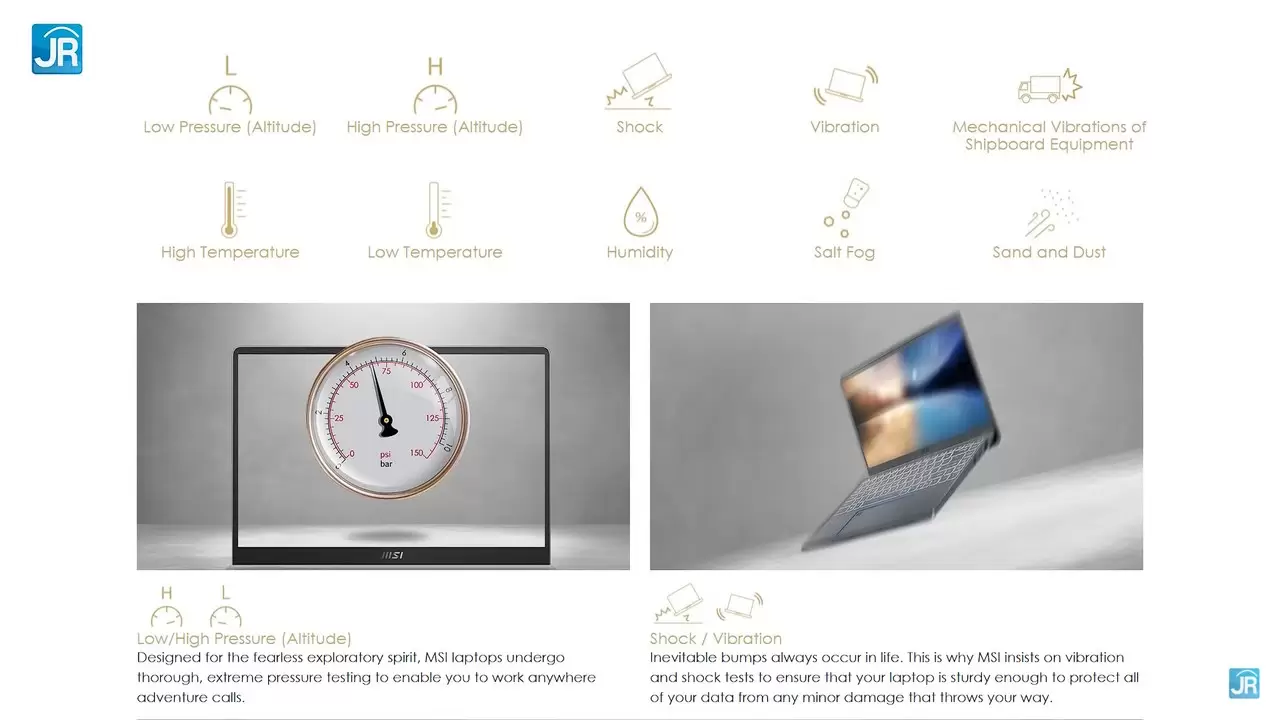 Laptop ini memiliki form factor Clamshell, dengan material bodi menggunakan Alumunium yang dibentuk menggunakan CNC Machine, sehingga membuatnya sangat kokoh. Laptop ini juga telah lolos 10 uji ketahanan berstandar militer MIL-STD-810G (SS MIL-STD-810G). Oleh karena itu tidak aneh jika bodi Laptop ini terasa begitu kokoh dan padat seperti batu saat kami pegang.