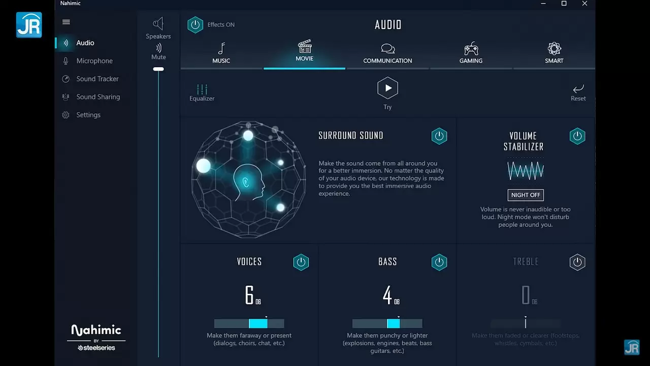 Di aspek audio, lapotp ini dilengkapi dengan empat buah Speaker Dynaudio dengan arah keluaran suara ke alas Laptop. Disediakan Software Nahimic untuk mengatur profil suara dan Equalizer.