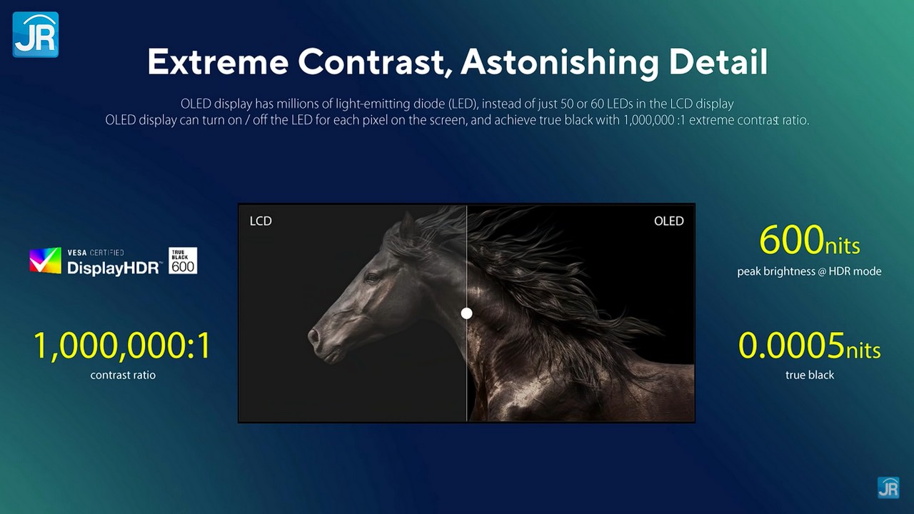 Layarnya juga telah memiliki beberapa sertifikasi seperti VESA Display HDR True Black 500 dan TUV Rheinland Low Blue Light yang menjamin emisi cahaya biru aman dan nyaman untuk mata.