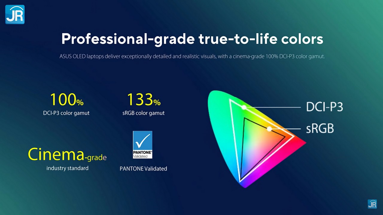 Panel yang digunakan yaitu OLED, yang menurut ASUS Tingkat kecerahannya berada di 400 nits, dengan peak brightness di 600 nits. Color gamutnya yaitu 100% DCI-P3 dan diklaim mampu menghasilkan 1.07 miliar warna. Jadi ini memang merupakan layar yang dikhususkan untuk para Content Creator kelas profesional. Apalagi dengan adanya logo Pantone Validated di laptop ini.