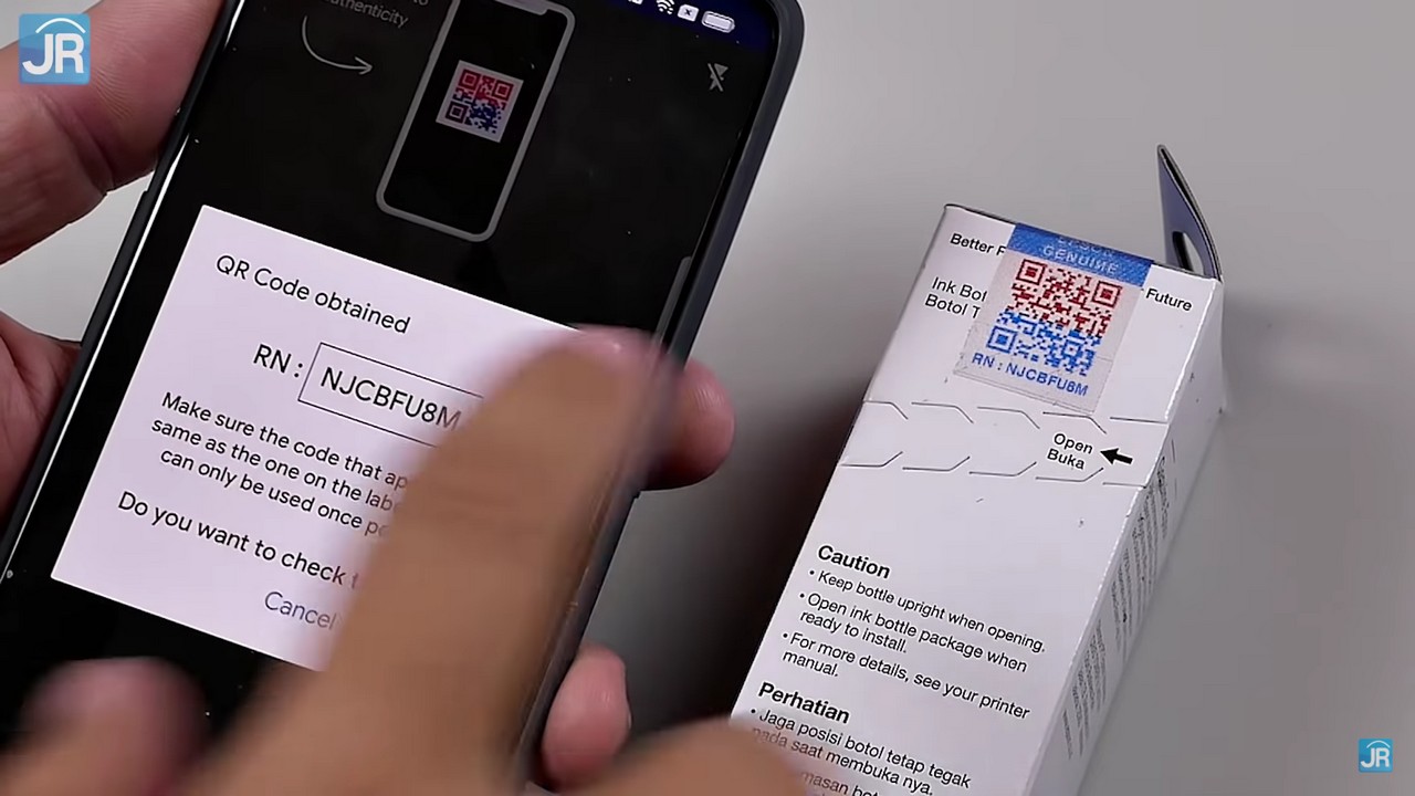 Pastikan ada bagian dari QR Code yang masih tertutup lapisan pelindung. Kalau lapisan sudah rusak atau justru stiker QR Code-nya yang rusak, laporkan consumable tersebut karena kemungkinan besar QR Code sudah di-scan, keaslian consumable tidak bisa dipastikan.