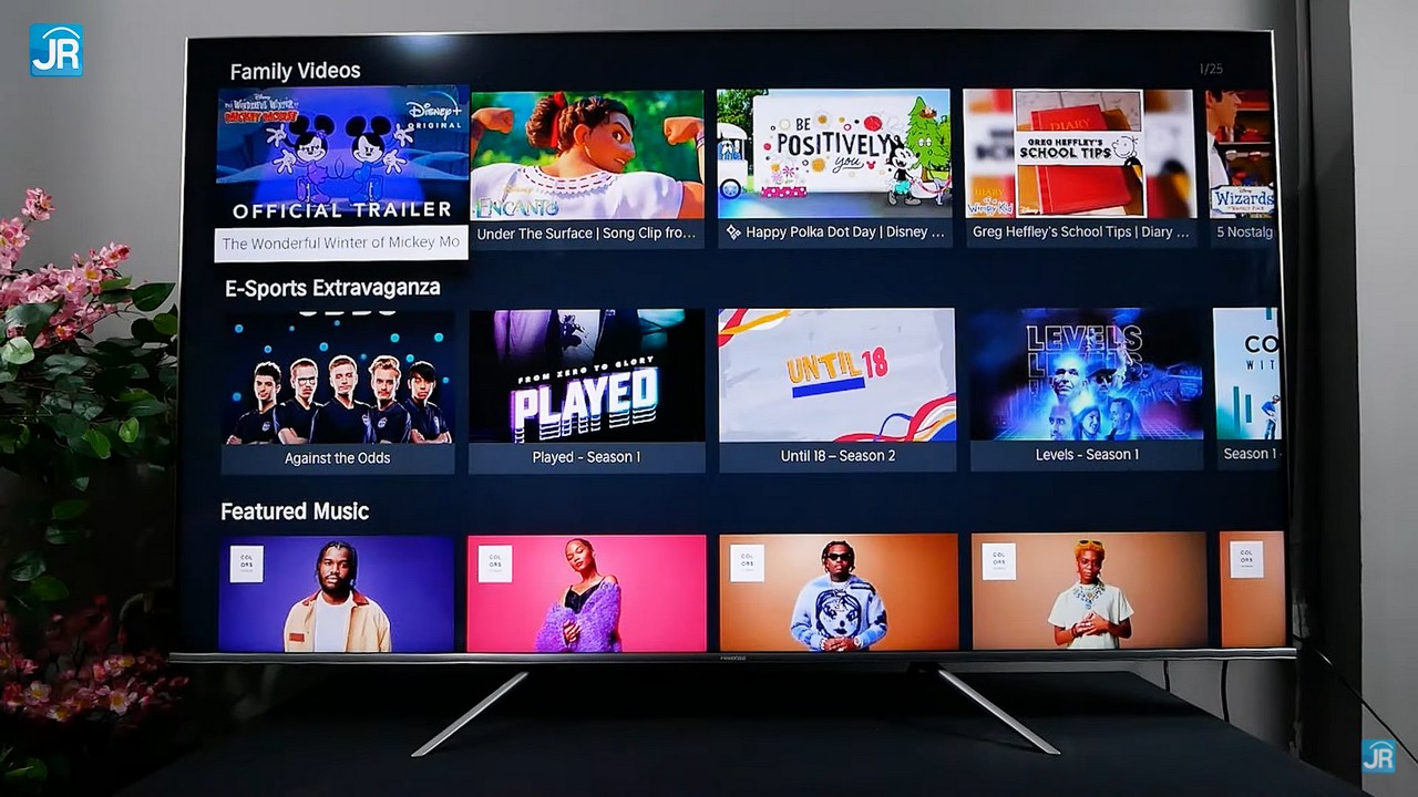 TV ini menggunakan VIDAA U5, dengan user interface yang menurut kami mirip Google TV. Di bagian atas bisa dijumpai daftar beberapa aplikasi yang ada. Sementara sebagian besar layar akan diisi dengan rekomendasi konten. Sayangnya, rekomendasi konten ini baru menampilkan konten apa yang tersedia dari aplikasi bawaan di TV.