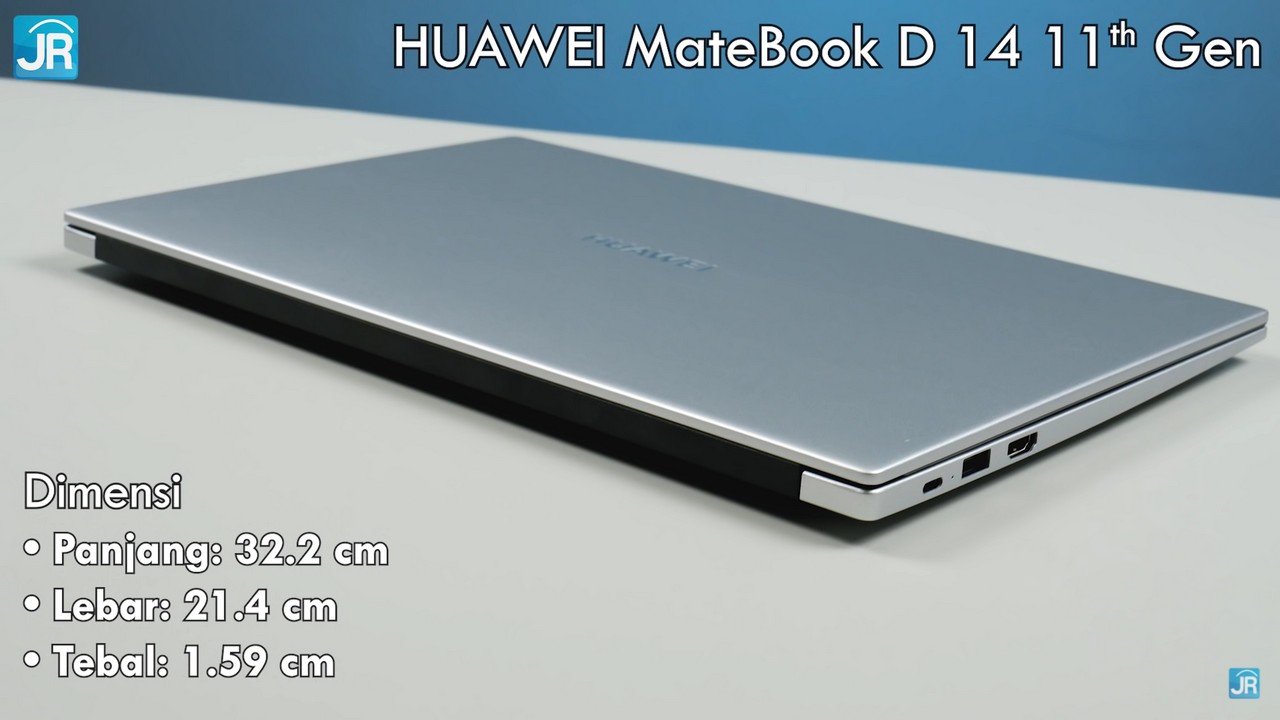 Huawei Matebook D14 Intel 11th Gen masih menggunakan form factor Clamshell/Laptop klasik. Material yang digunakan adalahFull Aluminum Body, yaitu menggunakan Aluminum di keseluruhan bodi membuat laptop ini kokoh, namun tetap ringan.