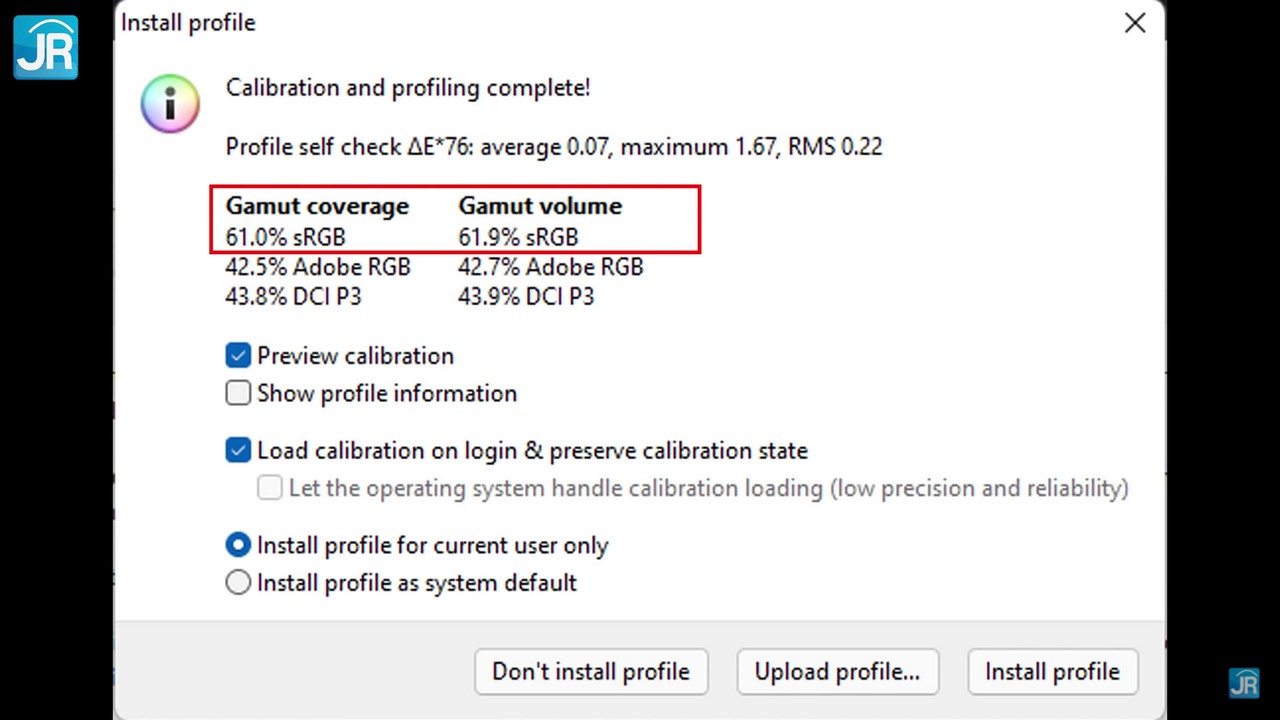 - Gamut Coverage dan Volume ada di kisaran 61% sRGB (mendekati 45% NTSC)
