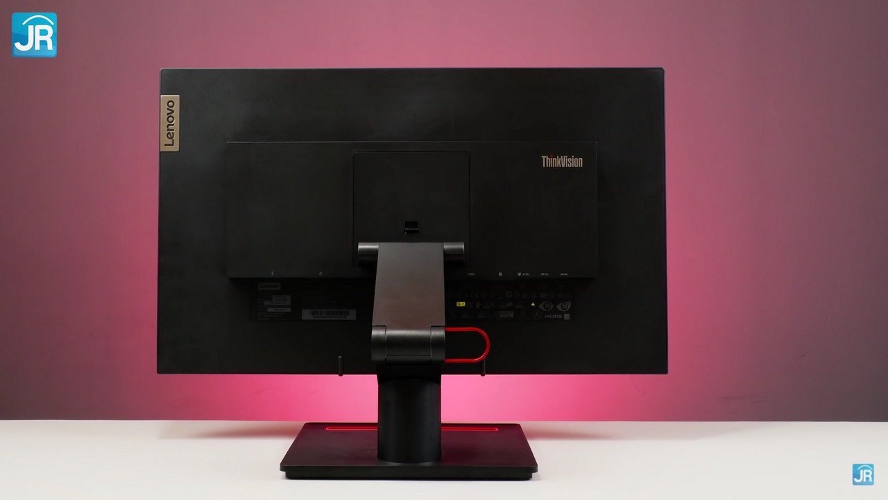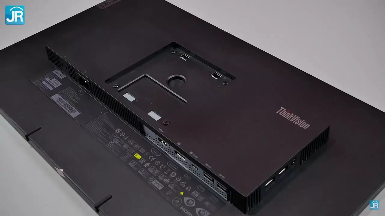 Sedangkan pada sisi kiri bawah monitor, terdapat logo ThinkVision. Nah, untuk sisi belakang monitor terdapat logo ThinkVision di tengah dan logo lenovo pada sisi kiri atas.