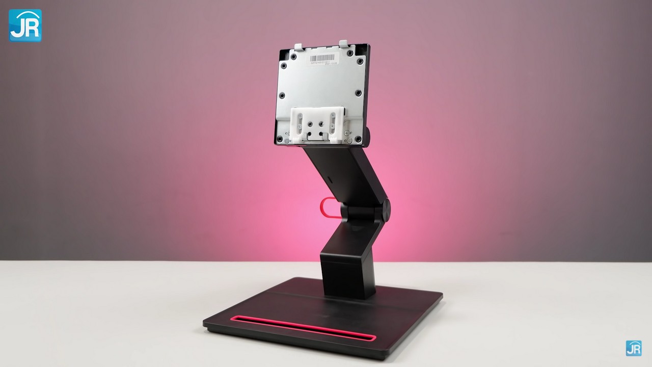 Tentunya di sisi belakang ini ada lubang VESA Wall Mounting berukuran 100 x 100 mm bila kita ingin memasangnya di dinding. Di leher stand terdapat lubang Cable Management berwarna merah.