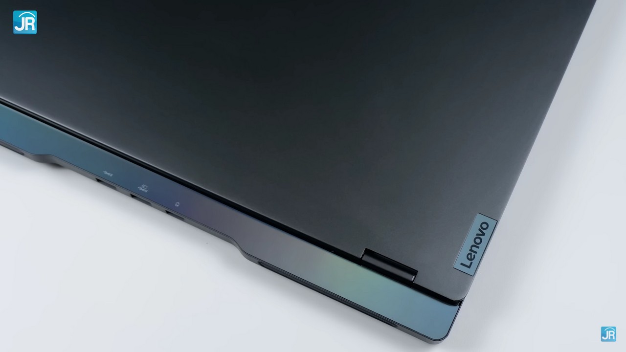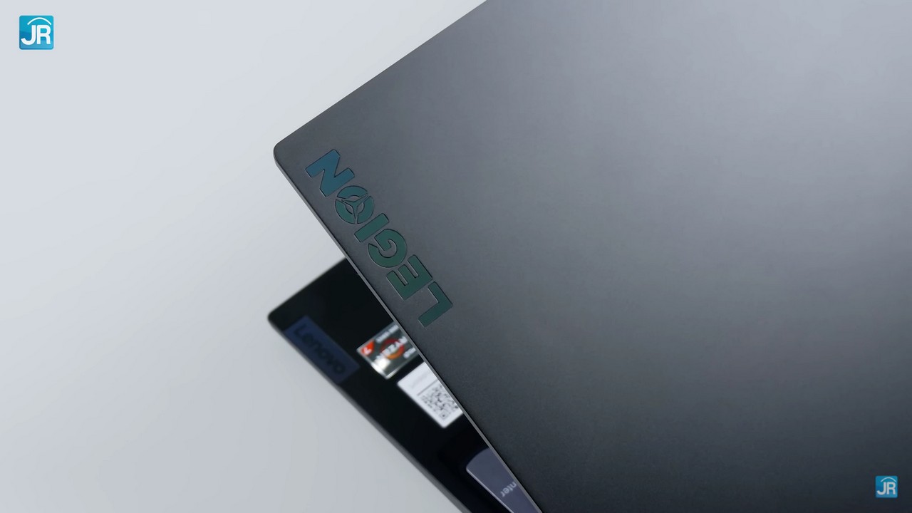 Di bagian belakang layar terdapat logo Legion yang terukir dengan warna hologram mengkilat di pojok kiri atas, dengan logo Lenovo kecil di pojok kanan bawah.