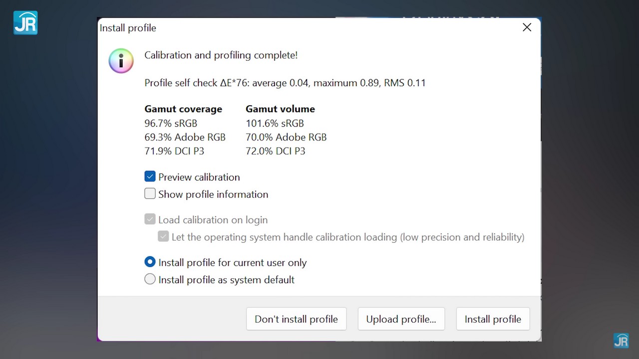 Layar ini juga mendukung Dolby Vision, serta memiliki fitur X-Rite Pantone untuk mengubah color profile pada layar dengan pilihan: 709, sRGB, Default dan Not Calibrated.
