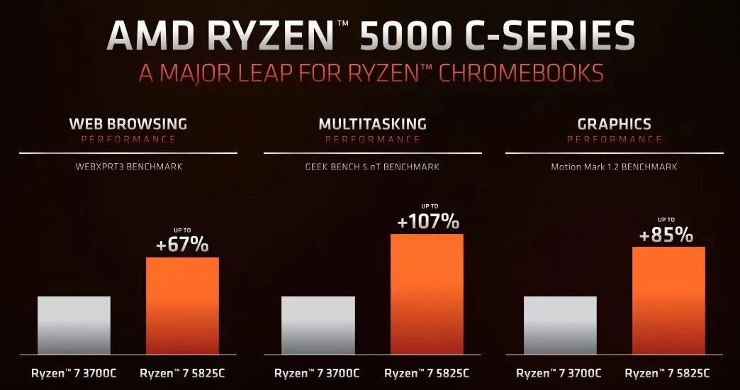 Model tertinggi yaitu Ryzen 7 5825C, yang diklaim AMD sebagai x86 8-core berkinerja tinggi pertama di dunia untuk Chromebook.