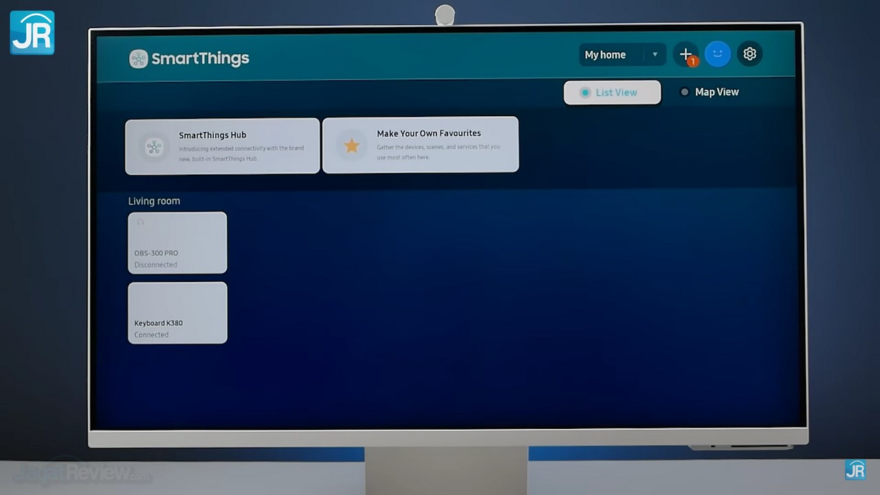 Dengan adanya SmartThings kita bisa mengatur perangkat IoT yang ada di rumah kita, contohnya seperti CCTV, Lampu, Kulkas, Alarm, dll, Melalui monitor ini.