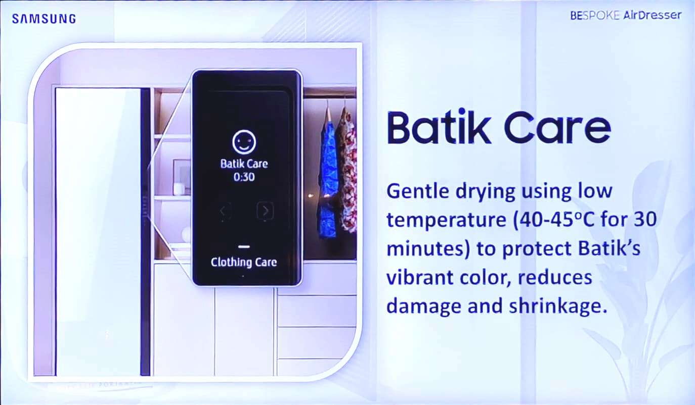 “Bespoke AirDresser bahkan menghadirkan fitur unik Batik Care yang dikhususkan untuk menangani koleksi pakaian batik agar lebih tahan lama. Tidak perlu ragu untuk mengenakan batik warisan budaya dengan bangga, karena Bespoke AirDresser akan membantu konsumen Indonesia untuk merawatnya dengan tepat,” lanjut Melvin.