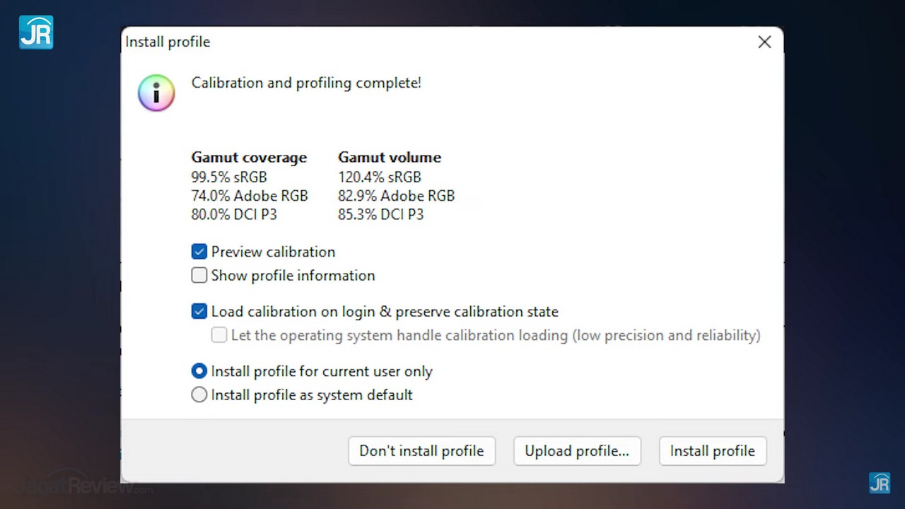 - Sementara tingkat Gamut Coverage 99.5% sRGB dan Gamut Volume 120.4% sRGB – Sesuai dengan yang dijanjikan. Harusnya sih diklaim 100% sRGB aja ini. (SS Display Color Gamut)