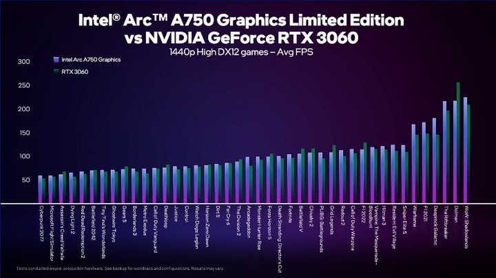 Hasilnya, performa Arc A750 hanya selisih 3-5 persen dari RTX 3060 dalam pengujian di resolusi 1080p dan 1440p. Bahkan dalam beberapa judul seperti Cyberpunk 2077, Fortnite, Microsoft Flight Simulator, rata-rata FPS Arc 750 dapat mengungguli RTX 3060.