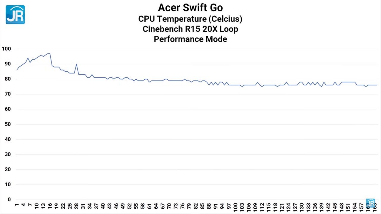 Pada mode Performance, suhu prosesor sempat naik ke 100 °C di sepertiga durasi awal pengujian kemudian turun di bawah 90 °C hingga akhir pengujian.