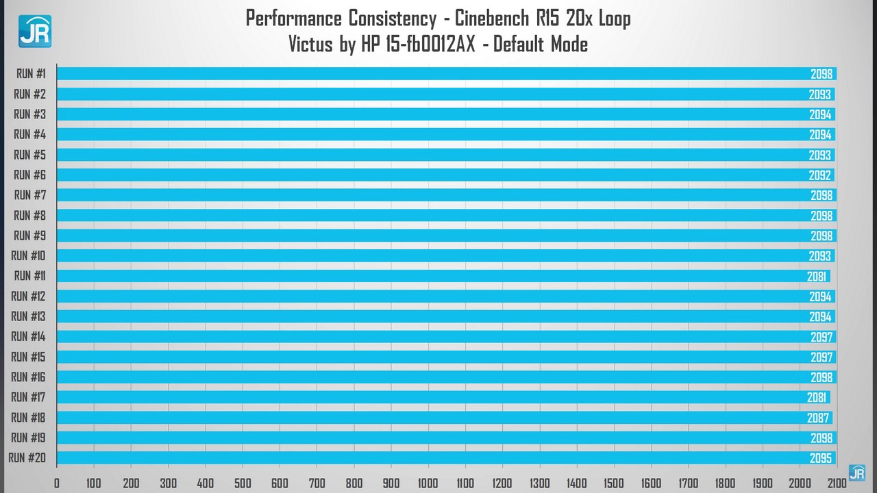 Pada review Victus by HP 15-fb0012AX, pengujian dilakukan dengan Performance Mode Default, Fan Auto, dan Brightness 50% serta Volume 25%. Hasilnya :