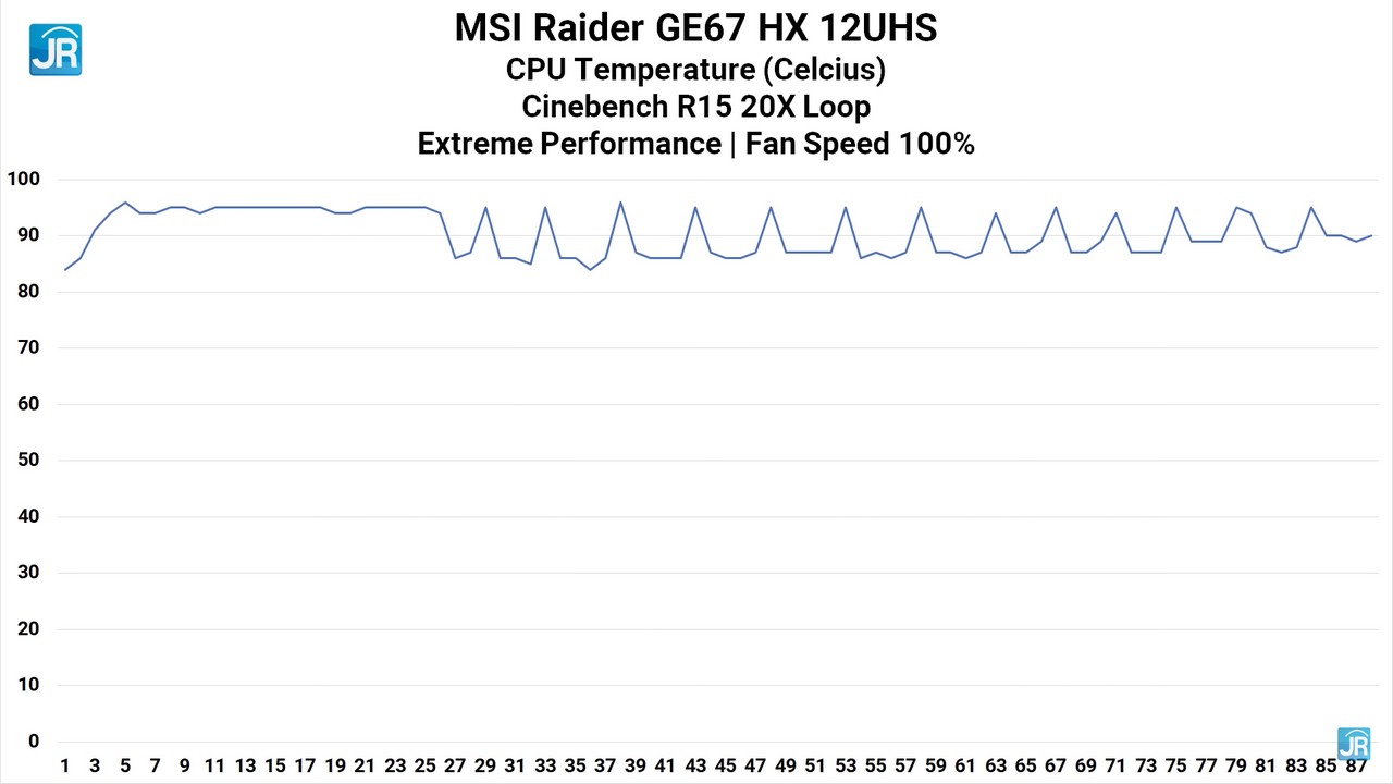 Saat menggunakan mode Extreme Performance dengan kecepatan kipas di 100%, suhu prosesor sempat ada dikisaran 94-95 °C di beberapa Run awal pengujian sebelum akhirnya mengalami naik turun direntang 86-95 °C