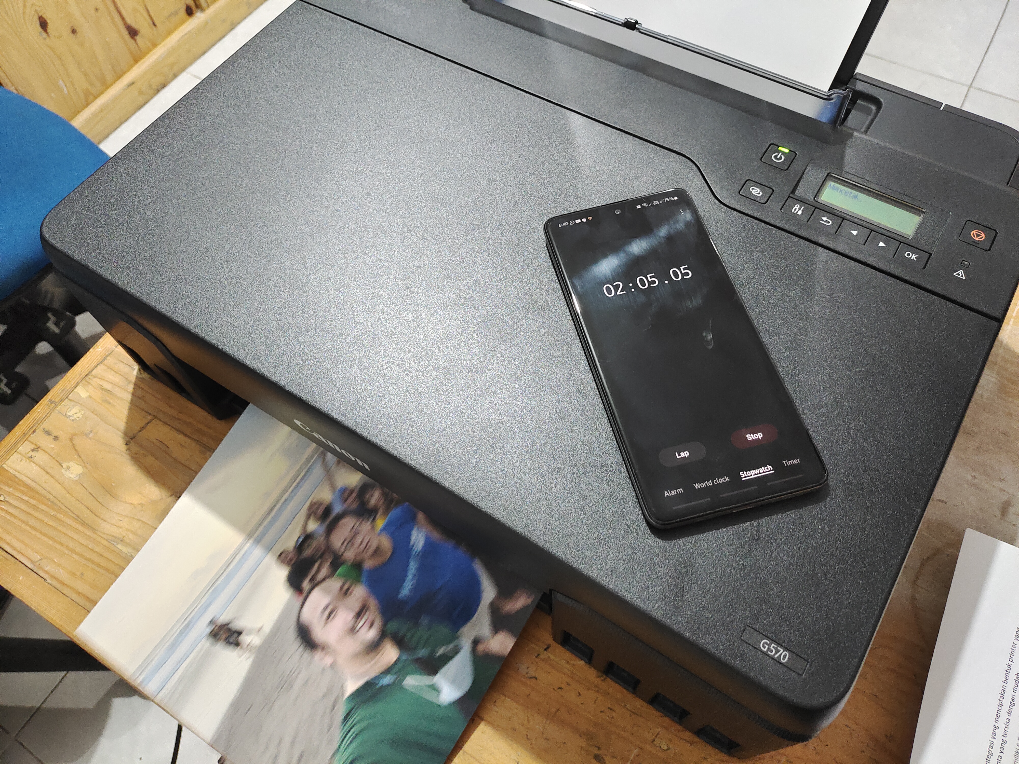 Ini tergolong cukup cepat, karena untuk mencetak foto dengan detail dan warna yang berkualitas tinggi ini memang membutuhkan durasi yang lebih lama dibandingan mencetak dokumen atau foto biasa. Bukan yang paling kencang, tapi ini sudah cukup kencang.