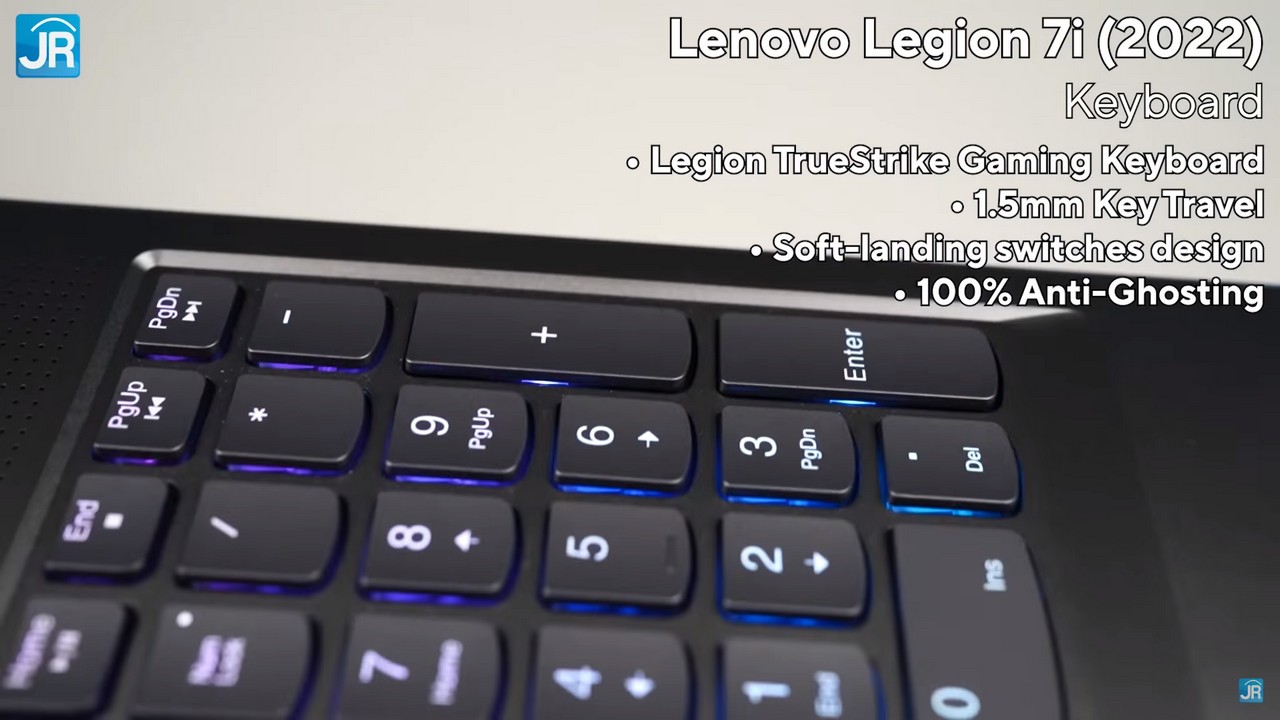 Lenovo Legion 7i (2022) menggunakan Legion TrueStrike Gaming Keyboard dengan 1.5mm Key Travel, serta soft-landing switches design. Ini Membuat feeling saat mengetik terasa nyaman. Keyboard ini juga mendukung 100% Anti-Ghosting, dan dalam paket penjualan disediakan 4 keycaps keramik dan cadangan switch. Ini dapat digunakan untuk mengubah keycaps default tombol WASD dari keyboard ini.