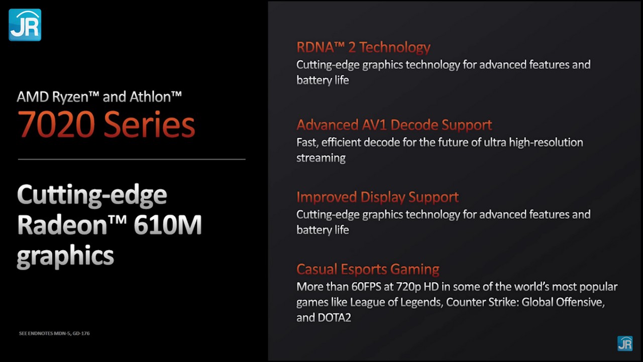 - Prosesor AMD 7020 Series sudah menggunakan proses fabrikasi 6 NM terbaru seperti di Ryzen 6000 Series. Prosesor generasi sebelumnya masih menggunakan fabrikasi 7 NM