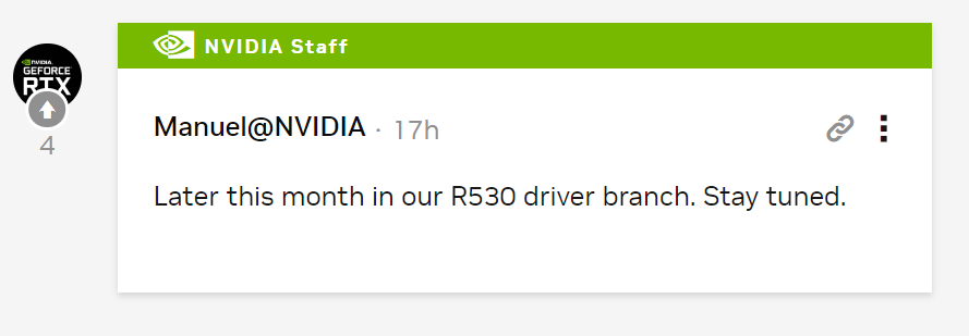Nah, sekarang NVIDIA mengumumkan driver baru tersebut akan segera hadir. Selain itu, NVIDIA juga membenarkan bahwa VSR pada browser Chrome hanya bisa bekerja dengan driver R530 atau yang lebih baru. Driver R520 (528.49) yang baru dirilis pekan ini belum mendukung pengaktifan VSR via NVIDIA Control Panel.