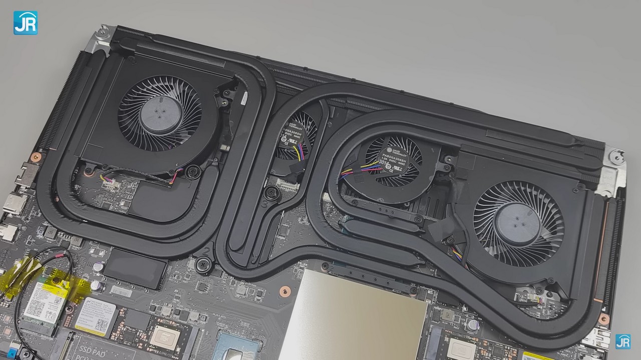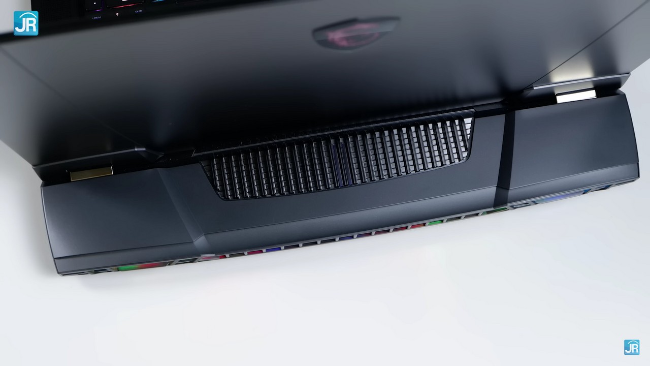 Selain dari bawah, intake udara laptop ini juga diambil dari bagian atas laptop – terlihat desain air intake di atas sistem pendinginnya. Ini memiliki arah Exhaust ke arah belakang dan sisi kanan-kiri laptop.
