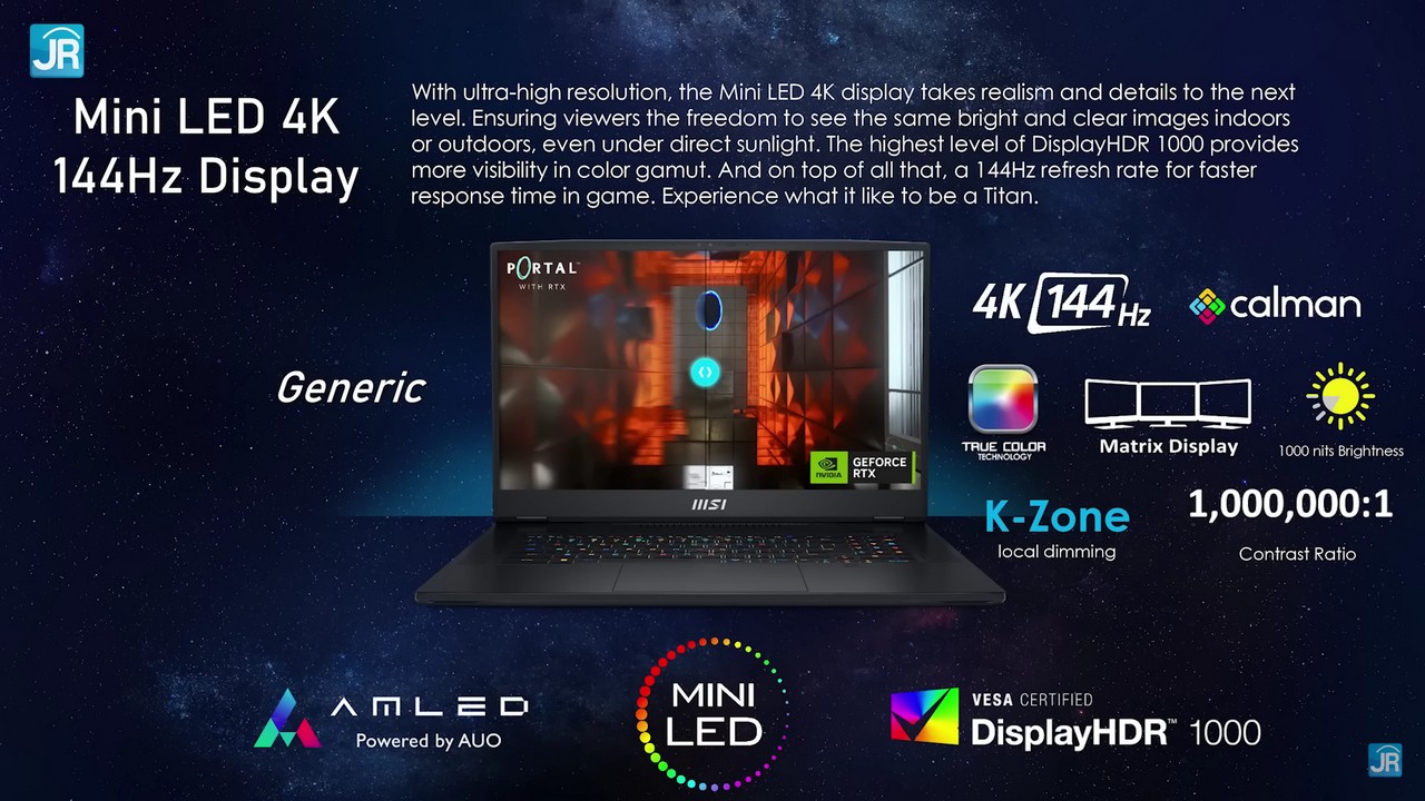 MSI Titan GT77 dilengkapi dengan panel Mini LED 4K 144Hz pertama di dunia, dengan ukuran layar 17,3 inci dan resolusi 4K (3840 x 2160). Peak brightness mencapai 1000 nits dan memiliki Color Gamut di 100% DCI-P3.