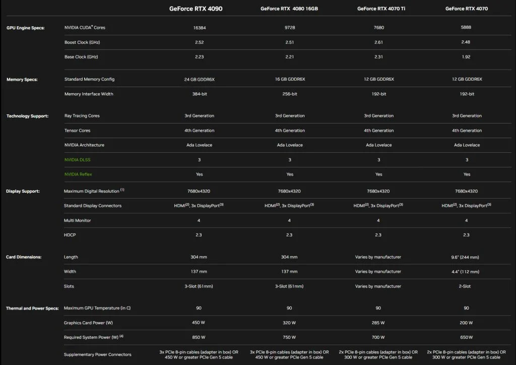 NVIDIA GeForce RTX 4070 mengusung GPU AD104 berbasis arsitektur Ada Lovelace, sama seperti model RTX 4070 Ti tapi dengan jumlah core dan clock speed yang agak dikurangi. RTX 4070 memiliki 5888 CUDA core dengan boost clock maksimal di angka 2475Mhz.