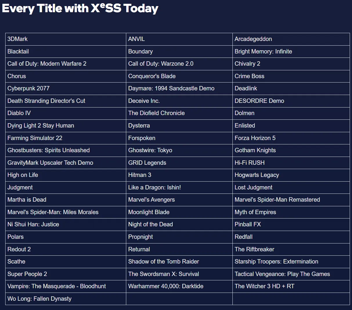 Beberapa judul game populer yang telah mengintegrasikan XeSS di antaranya adalah Cyberpunk 2077, Assassins Creed Valhalla, Control, dan yang terbaru Diablo IV. Hal ini menunjukkan bahwa banyak pengembang yang telah percaya pada solusi Intel untuk meningkatkan pengalaman visual pada game mereka.