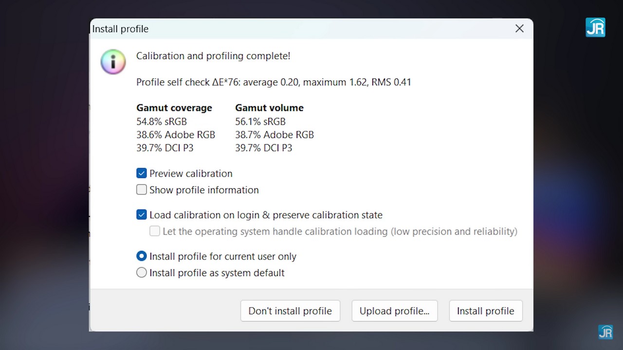 Layar MateBook D 14 memiliki color gamut sebesar 45% NTSC dan kecerahan maksimum 300 nits menurut HUAWEI. Dalam pengujian kami, ditemukan bahwa laptop ini memiliki gamut coverage sebesar 54,8% sRGB dan gamut volume sebesar 56,1% sRGB. Kecerahan puncaknya mencapai 308 nits.