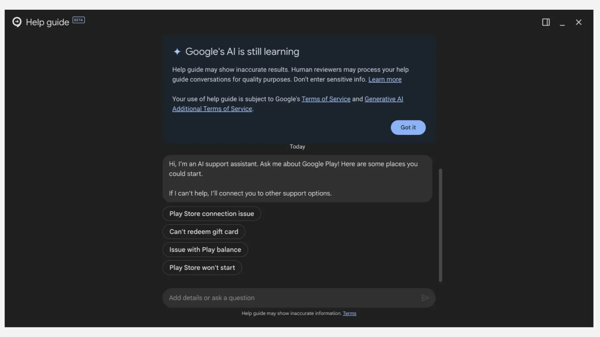Selain itu, saat ini hanya halaman dukungan untuk Google Play di mana pengguna dapat mengetikkan pertanyaan secara langsung lalu memberikan pertanyaan lanjutan. Untuk halaman dukungan lain, pengguna harus bertanya melalui prompt rekomendasi, yang kemudian AI akan memberikan prompt terkait.