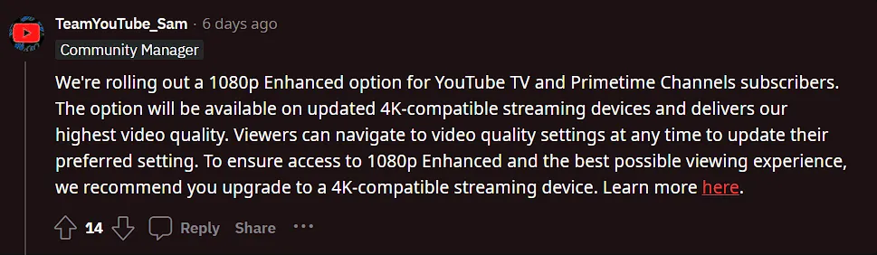Namun, layaknya di versi website dan mobile, untuk dapat mengakses 1080p Enhanced pengguna harus berlangganan ke YouTube Premium. Di Indonesia sendiri, YouTube Premium memiliki biaya langganan sebesar Rp59.000 / bulan untuk paket individual.