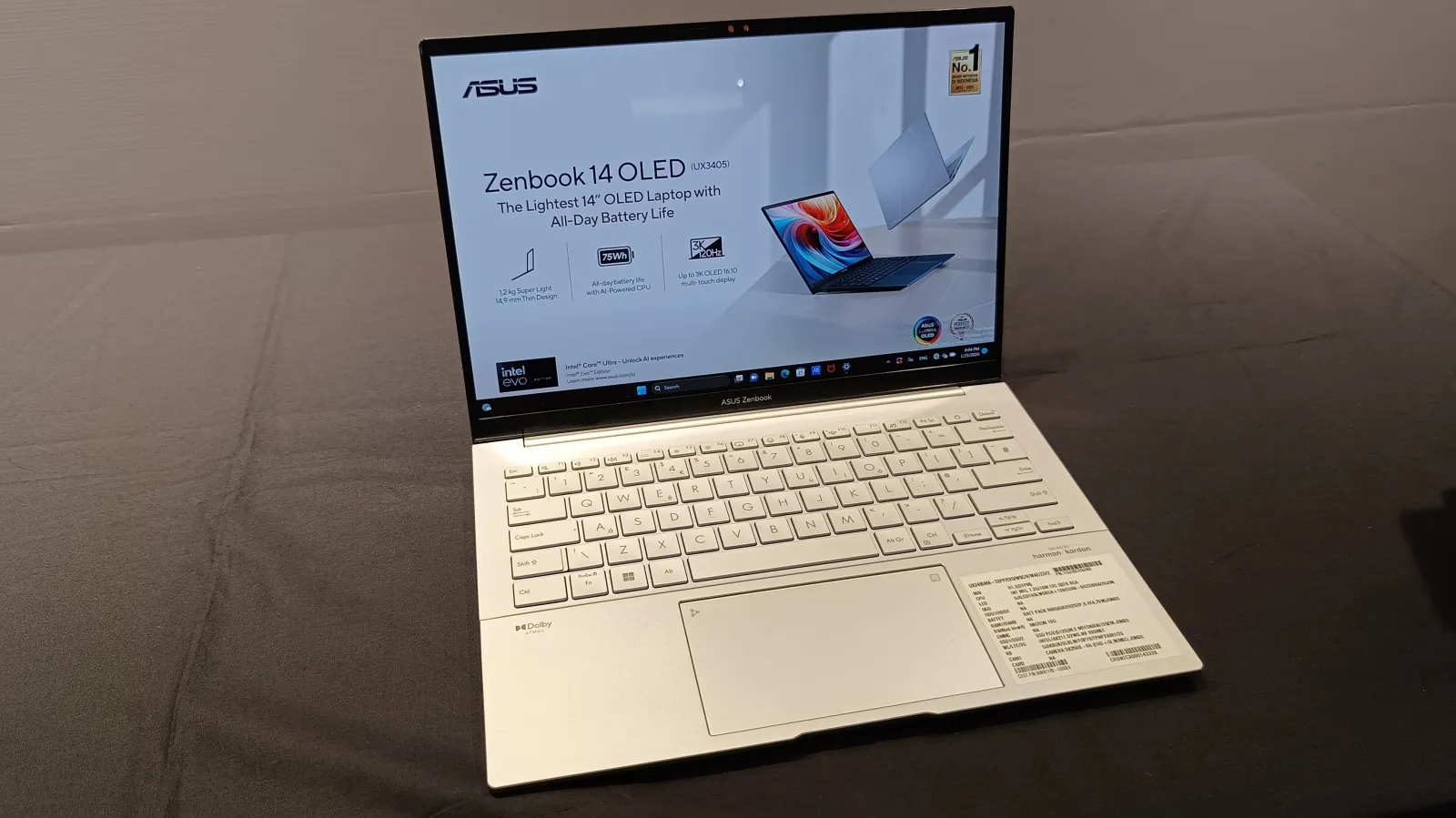 Layarnya sendiri berukuran 14 inci dengan panel ASUS Lumina OLED. Spesifikasi layar tersebut kini ditingkatkan dengan resolusi 3K (2880 x 1800) dan refresh rate 120Hz. Layar Zenbook 14 OLED (UX3405) memiliki color gamut 100% DCI-P3 dan tingkat kecerahan maksimal hingga 600 nits. Owh iya, tersedia juga varian dengan dukungan layar touchscreen.