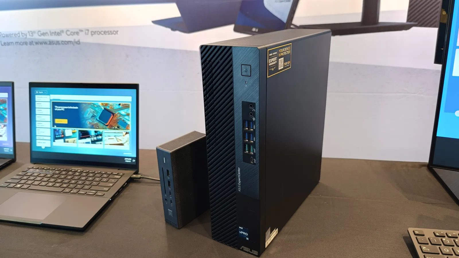 Selain laptop, ASUS juga menghadirkan lini ExpertCenter. Ada PC desktop ExpertCenter D9 yang memiliki dua ukuran chasis 9L (D900SDR) dan 17L (D900MDR). Sementara ukuran 9L bisa menghemat ruang kerja, ukuran 17L memungkinkan pengguna menyematkan spesifikasi GPU yang lebih tinggi dan besar hingga NVIDIA GeForce RTX 3060 dan Intel Arc A380.