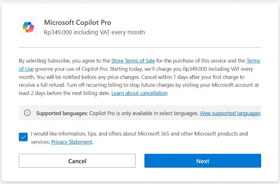 Dari pantauan kami, Copilot Pro untuk wilayah Indonesia memiliki biaya langganan sebesar Rp349 ribu per bulan. Dengan berlangganan, kalian akan mendapatkan performa maksimal dari Copilot dan juga akses ke GPT-4 dan GPT-4 Turbo meski di jam-jam sibuk. Tidak hanya itu, pengguna berbayar juga punya akses untuk membuat Copilot GPT versi mereka sendiri.