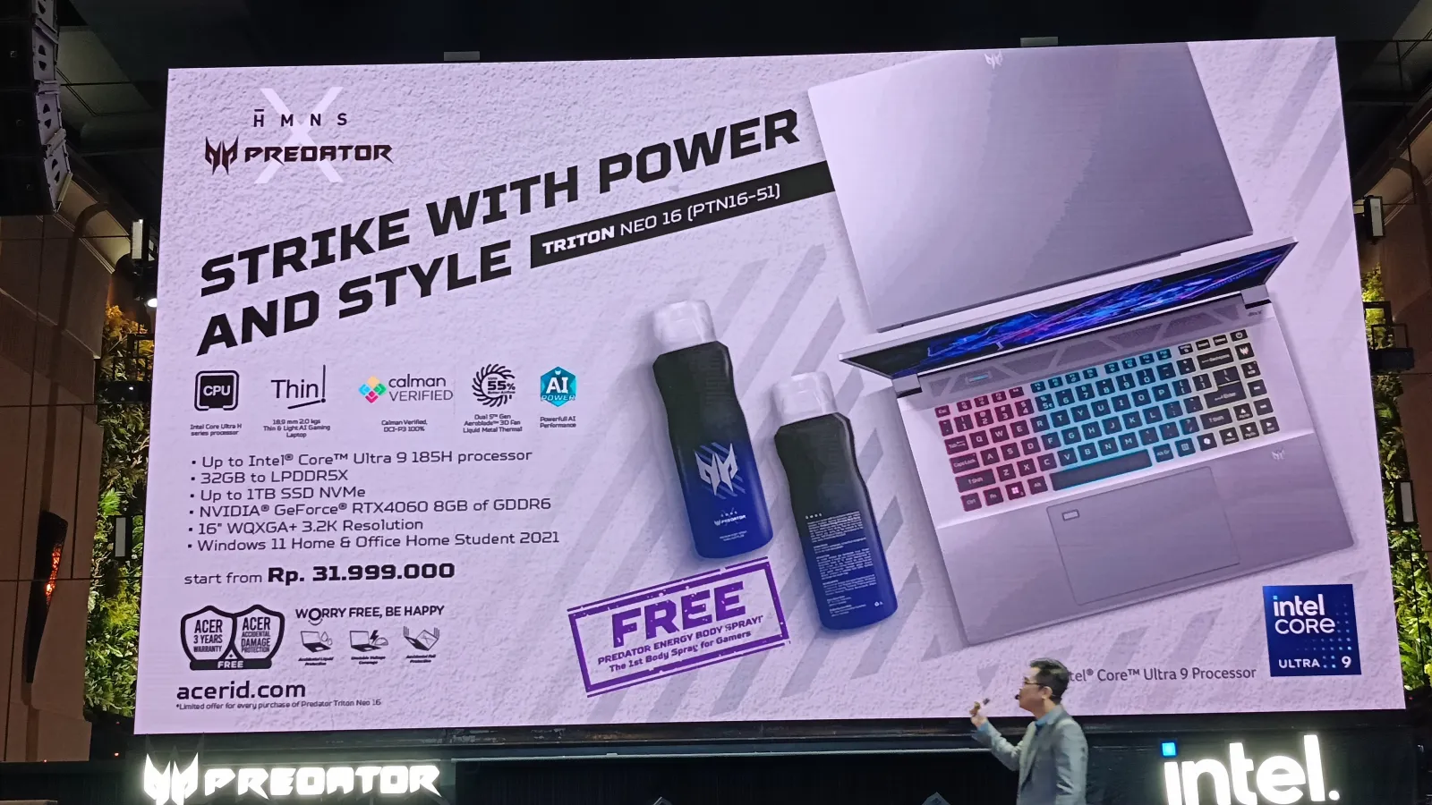 Predator Triton Neo 16 terbaru sudah tersedia dengan harga mulai dari Rp31.999.000 dan setiap pembelian di Blibli dan Acer Official Store juga akan mendapatkan Predator Energy Body Spray. Body spray juga dijual secara terbatas pada official online store HMNS di Shopee, Lazada, dan Tokopedia dengan harga Rp99.000.