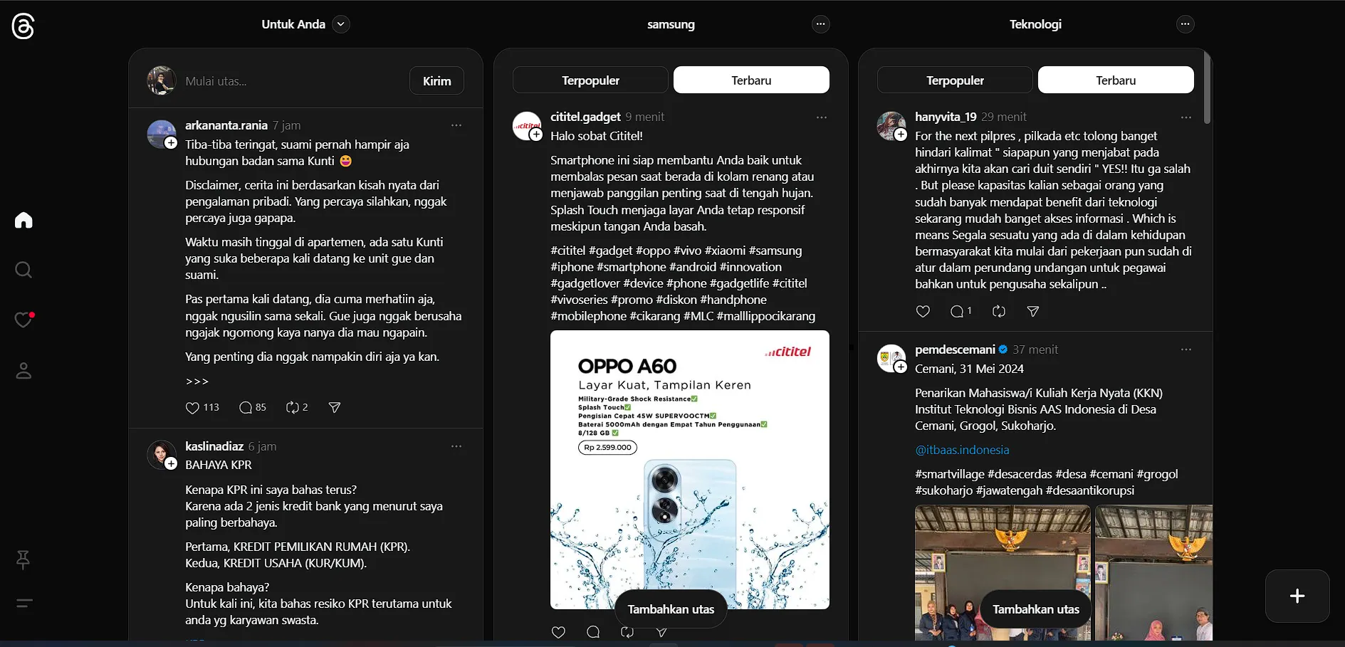 Tampilan baru tersebut, yang oleh pengguna Threads dijuluki sebagai “ThreadsDeck”, mengizinkan kalian untuk menyematkan hingga 100 feed berbeda di homepage alias halaman beranda Threads. Setiap kolom juga dapat diatur untuk diperbarui secara otomatis sehingga kalian dapat memantau postingan baru.
