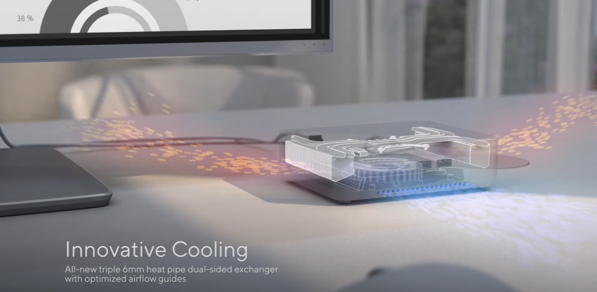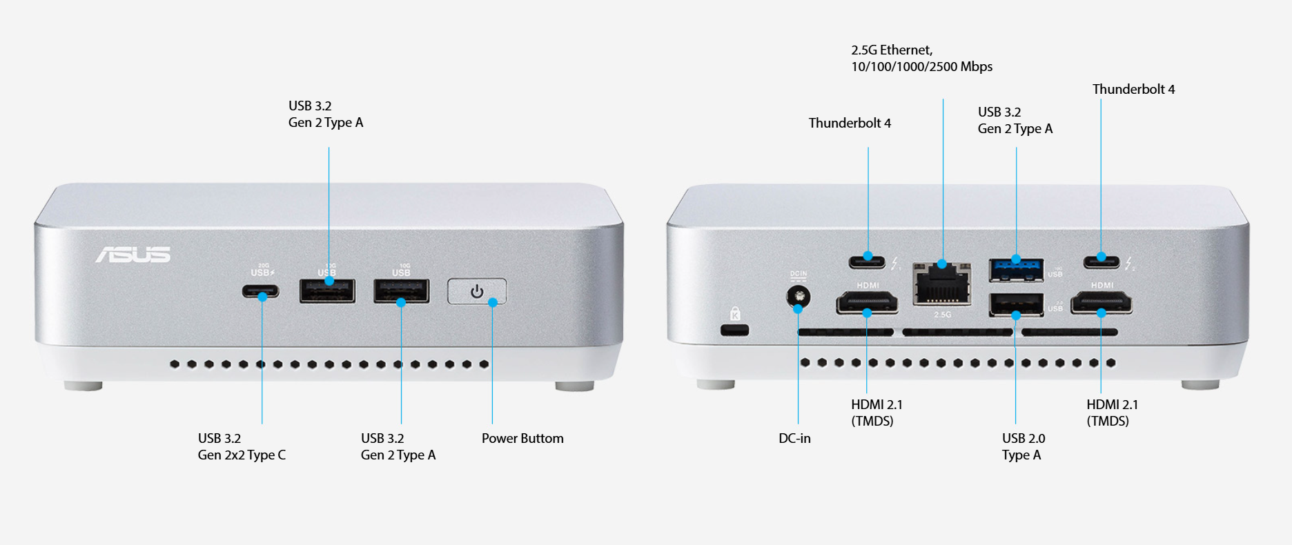 ASUS NUC 14 Pro+ ini memiliki desain yang ringkas dengan bodi berbahan aluminium yang berukuran 5 x 4 inci. Menariknya walaupun bodi dari perangkat ini terbilang kecil, ASUS tetap menyematkan sebuah sistem pendingin dengan 3 heatpipe dan 1 kipas. Konektivitasnya juga tergolong lengkap, di sisi depannya ada 1 port USB-C 3.2 Gen 2, dan 2 port USB-A 3.2 Gen 2. Sementara di sisi belakangnya ada 1 port USB-A 3.2 Gen 2, 1 port USB-A 2.0, 2 port Thunderbolt 4, dan 2 port HDMI 2.1.